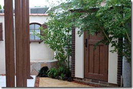 玄関前にパティオ角柱AショートとウォールC鎧戸付。