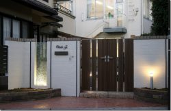 門柱・境界の塗壁・リビング前の中庭にLEDのエクステリア照明取り入れた夜も魅力的なトータル外構
