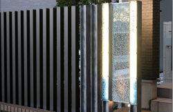 カラージュエルのブラーとミラー、2枚のジュエルグラスを取り付けた門柱のライトアップは、微妙に輝きを…