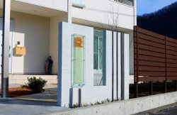 ガラスパネルとH鋼を使用したエクステリア ガラスパネルが2枚ある門柱 合せ硝子和紙挟みサインはオリジ
