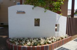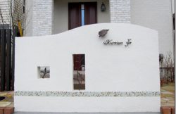 線で作った塗り壁の門柱に、可愛いアイテムを取り入れました。アルミ鋳物のデイーズサインにミニオーナメン