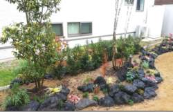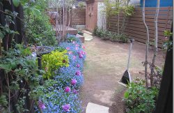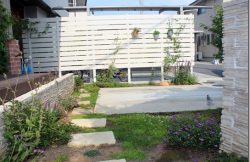 目隠し工事をしてから、しばらく時が過ぎて素敵な庭になっていました。 樹脂板塀を上…