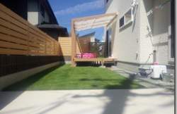 アルファウッドアイボリーで施工された目隠し塀は、愛犬が遊べる空間にもなっています。 …