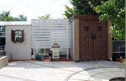 庭のリフォーム工事の時に隣地境界側にデイーズガーデンのカンナ物置を設置しましたが、よこにパティオを…