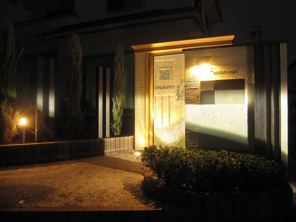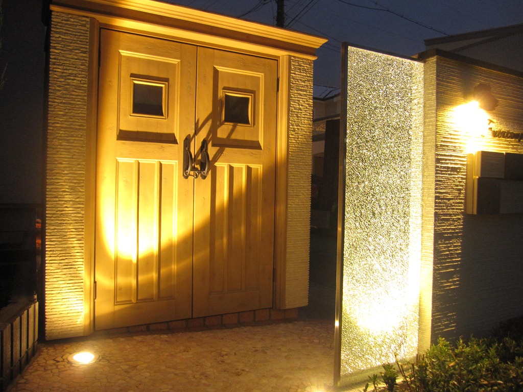 ●toledoのプレミアム門柱には、オリジナルが幾つもあり組み合わせて新しいスタイルのエクステリアを提案し施工しています。左側はアルミ製のH鋼右側が鉄製のH鋼で柱に挟まれているジュエルグラスもオリジナル商品で合わせ硝子サイン・特殊塗装サインも当社のオリジナル、合わせ硝子の中に入れられたリコストーン(硝子)も、そして夜間になると点灯するLEDテープもオリジナルシエクステリア商品になります。