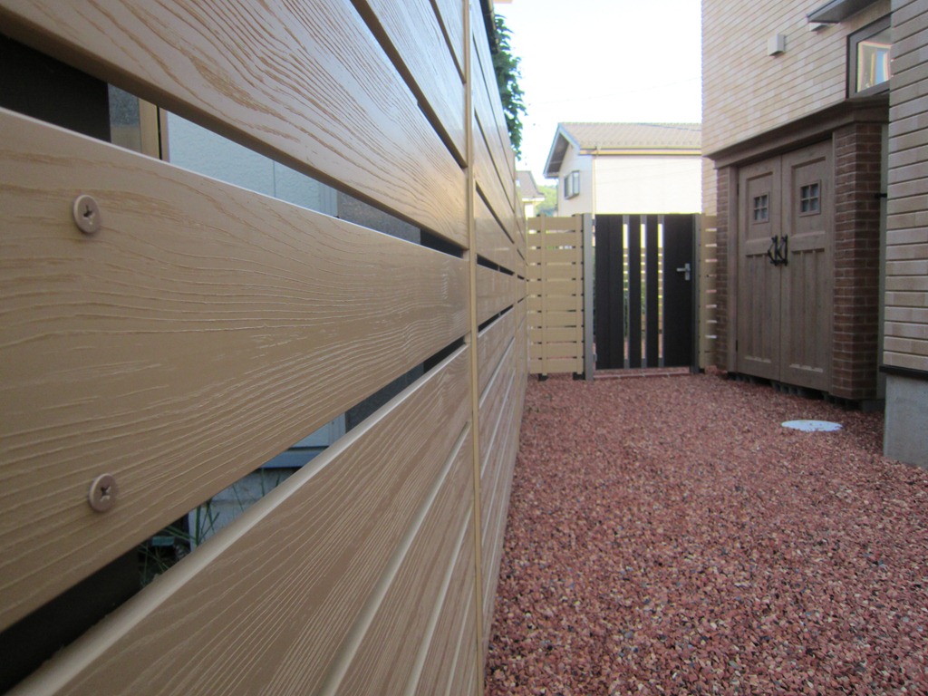 外からの視線を隠しプライベートが守られるように、又はデザイン性が高いのでフェンスに使用したりして樹脂板を塀変わりに、フェンスにしたりする現場がとても多いです。木製の板塀ではメンテナンスが大変なうえ耐久性にも問題があるので、近年はほとんどが樹脂板に代わっています。