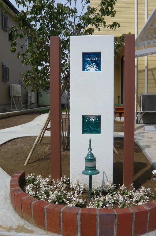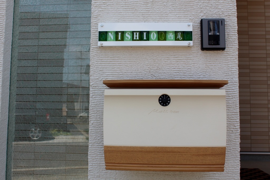 6ミリの厚みのフロート硝子を2枚合わせて、中に和紙を挟みこみ、名前の部分と下側の部分の和紙を変えて作るサイズがW300×H1.000×D12ミリのガラスパネルをビスで門柱の壁に取り付けます。合わせガラスの中に中間膜を入れることで、紫外線を99%カットしてしまい外に取り付けても和紙はほとんど変色することがありません。和紙にもいろんな種類と色があるので、パターンもかなりの数になると思います。
