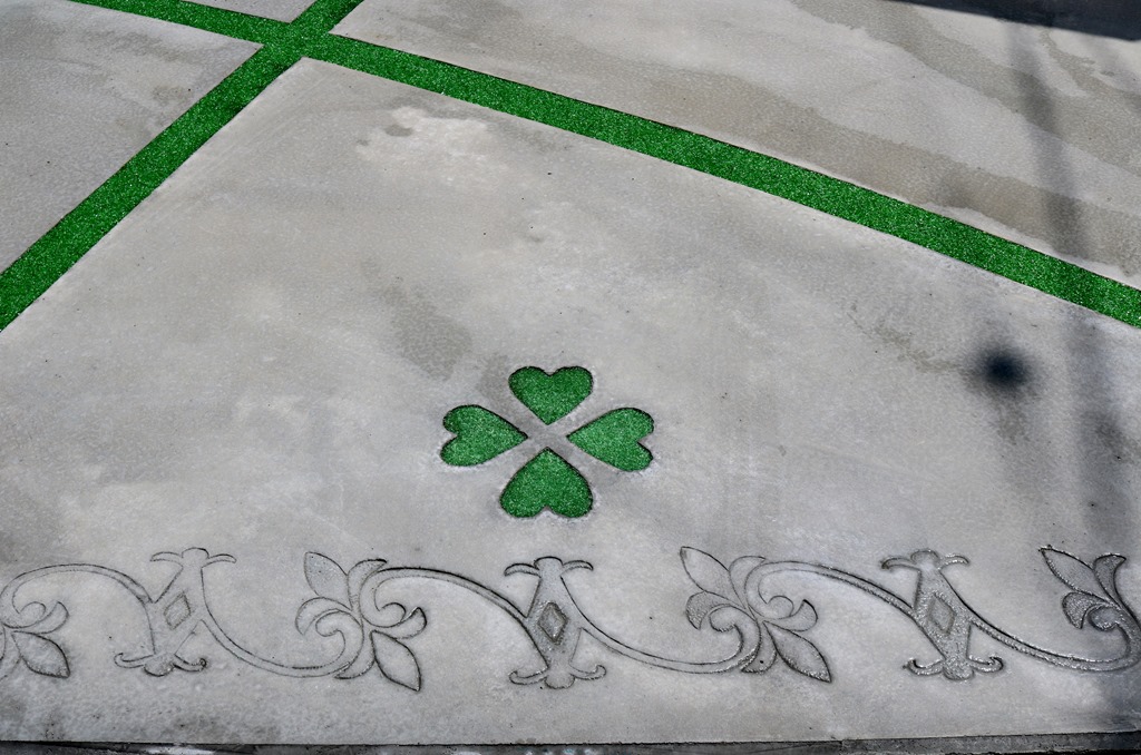 当社には、サインなどオリジナル商品がいくつかありますが、工法でも当社オリリジナルが幾つかあります、コンクリート打設時にマット型押しして模様と色を付けるドリームストーンは木目の他は石畳の模様があれます、またコンクリートの床にポイントで模様を付けるボーダーアートは葡萄模様の他に3タイプがあり、リサイクル瓶の破砕を樹脂で固めて作ったクリスタルアートがあります。