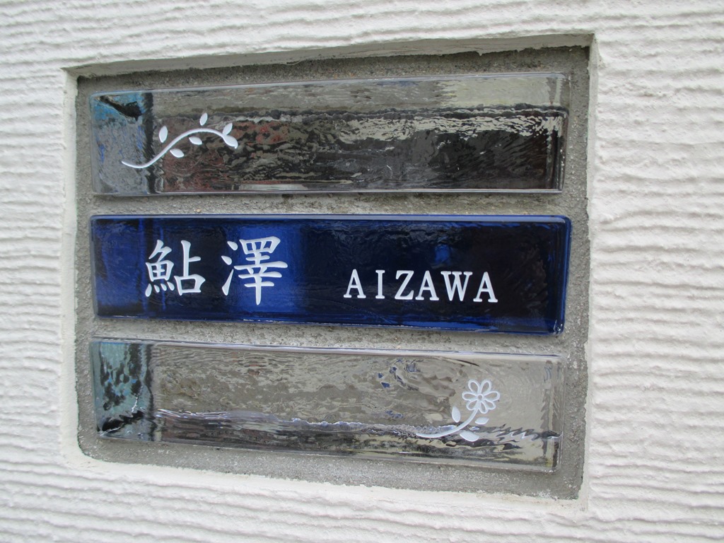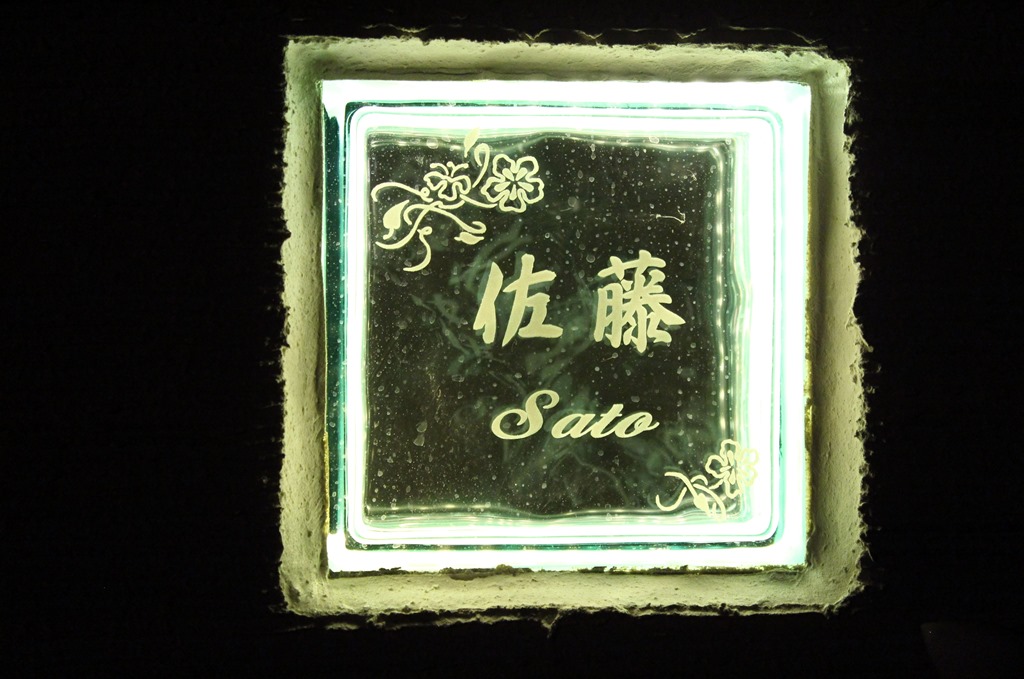 イタリア製ベネチアンガラスはレンガとほぼ同じ大きさです、そのベネチアンガラスブリックに彫りを入れ表札を作っています、重ねて積み上げ表札になるものは今までになかったと思います。ガラスの周りにLEDテープを巻きつけて光らせる表札もありませんでした、厚みのあるベネチアンガラスブリックは光が透過して壁の向こう側も見える表札です。