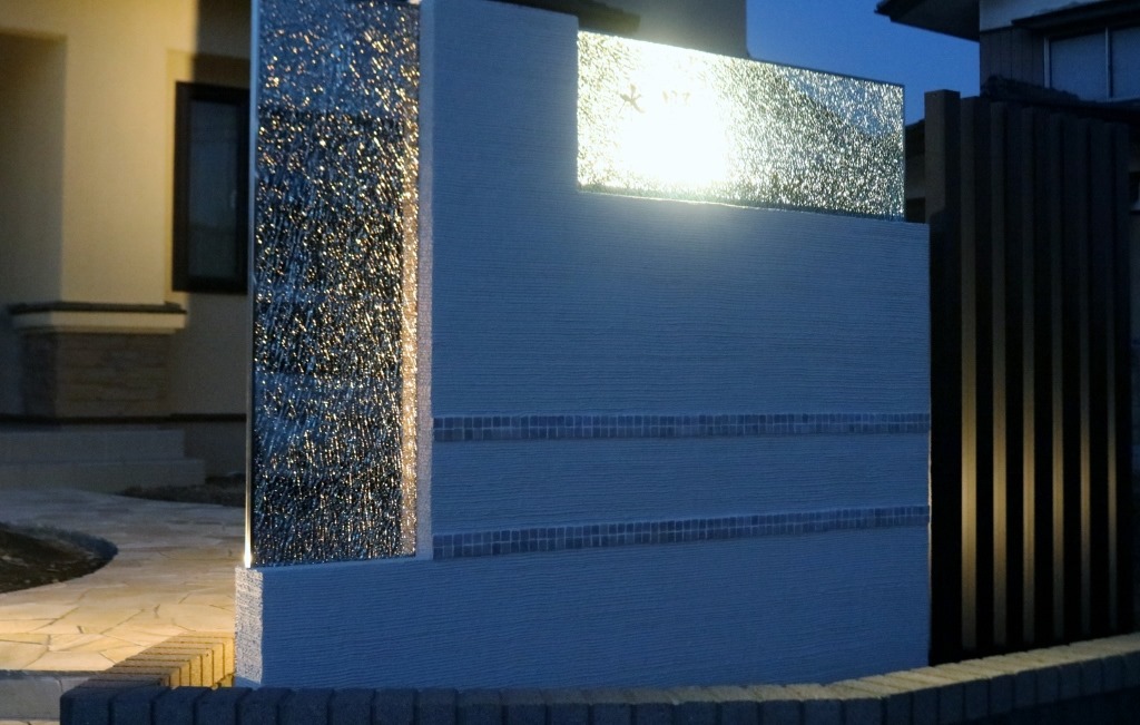 当社オリジナルをたくさん入れたプレミアム門柱の外構です。H鋼の特殊塗装錆胡桃・サインも特殊塗装の錆胡桃・ジュエルグラスも表側と裏側では違って見える特注使用のプレミアム。ジュエルグラスはきらきらが一番きれいに見えるミラーを使用。