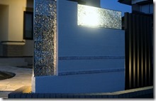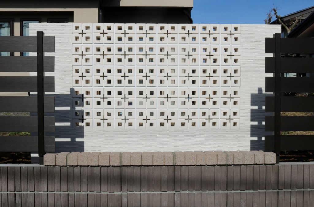 H鋼門柱の横にブリースブリツクのキュービツクフォーホワイトを塗り壁の間に挟むように積んでいます。