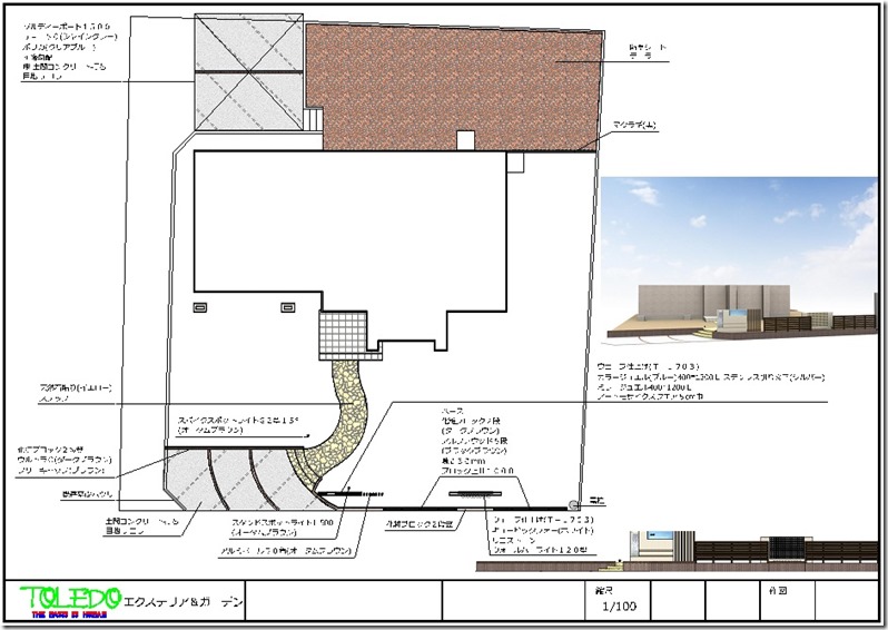 庭の中央には一段高くしてフラッドストーン・ジロンデでサークルを作りました、縁は高くする為にレンガを立てています。 センターは土を残しシンボルツリーを植えました。サークルの回りは防草シートを敷きその上に破砕瓦テコラを敷きこんでいます。