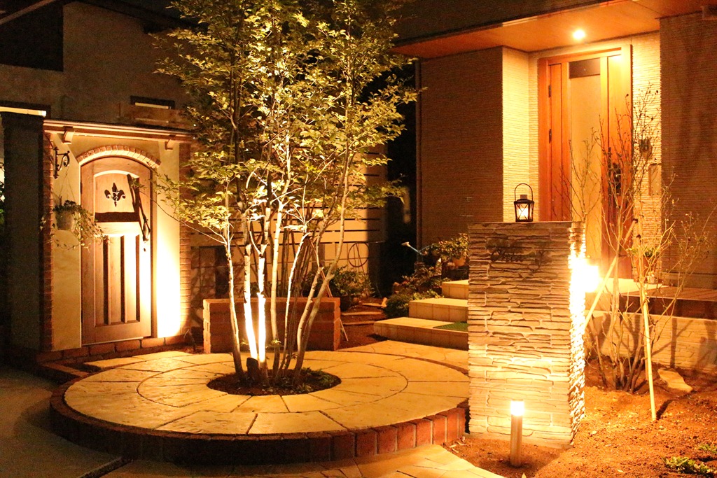 玄関の正面がシンボルツリーで隠れるようにしています。通路の途中にサークルを設けることで、変化のある通路に、また小さな庭スペースにしました。英国製のマドックZを積んだ門柱にはアルミサインと横に船舶ライトを取り付けています。昼と夜に違った表情見せる庭、門柱・シンボルツリー・カンナキュート物置をそれぞれLED照明でライトアップしています。