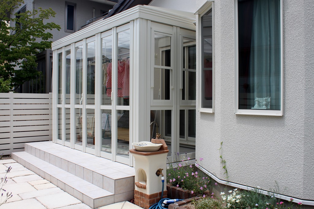 リビングの前にココマガーデンルームを取り付け、庭をいつでも眺めることができるようにしています。 イタリア製の300角タイルを貼り詰めた床を外側の犬走りまで貼り広めのテラス空間にしています。