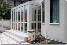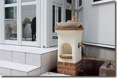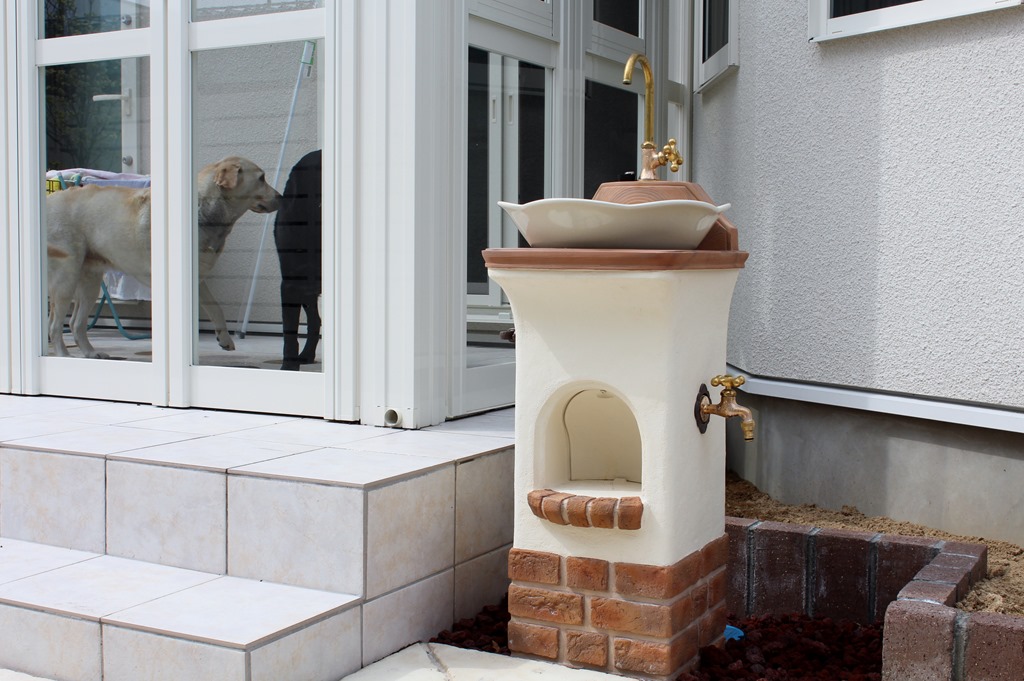 LIXIL自然浴エクステリア、暖蘭物語のアイボリーホワイトを愛犬の為に設置した現場です。タイルの貼られたガーデンルームからタイルステップを下りるとブラッドストーンの敷石が敷かれていて、ガーデンルームのすぐ横にディーズガーデンのスタンドウォッシュリリーが設置され愛犬の足洗い場も作りました。