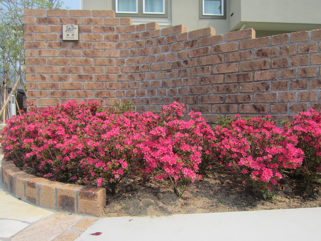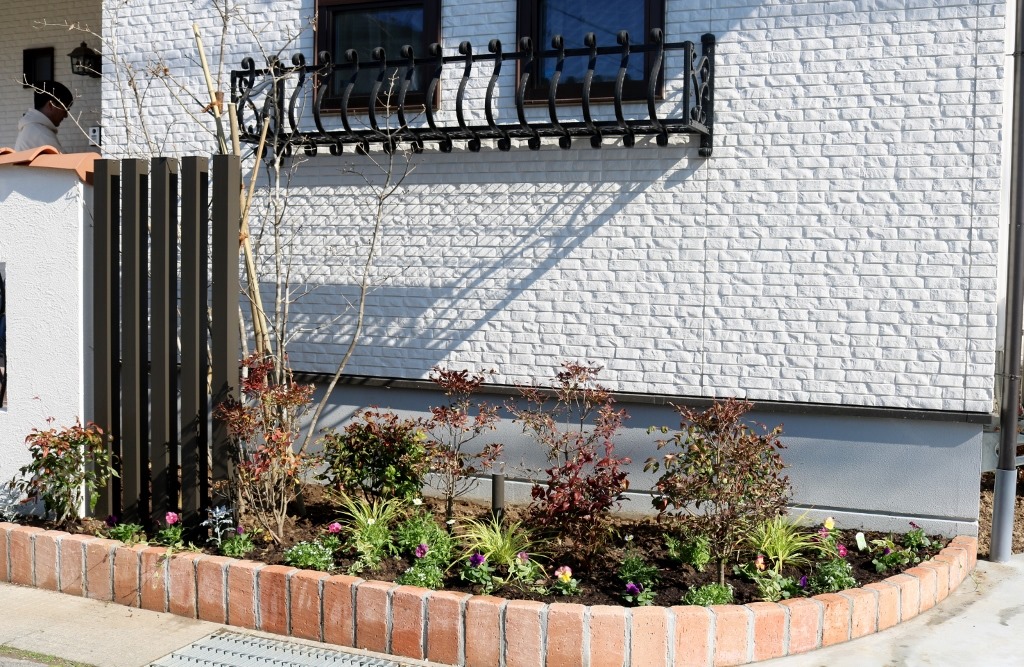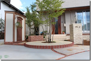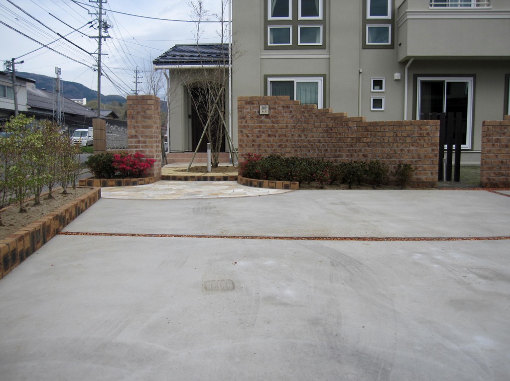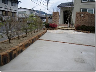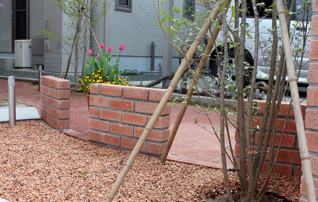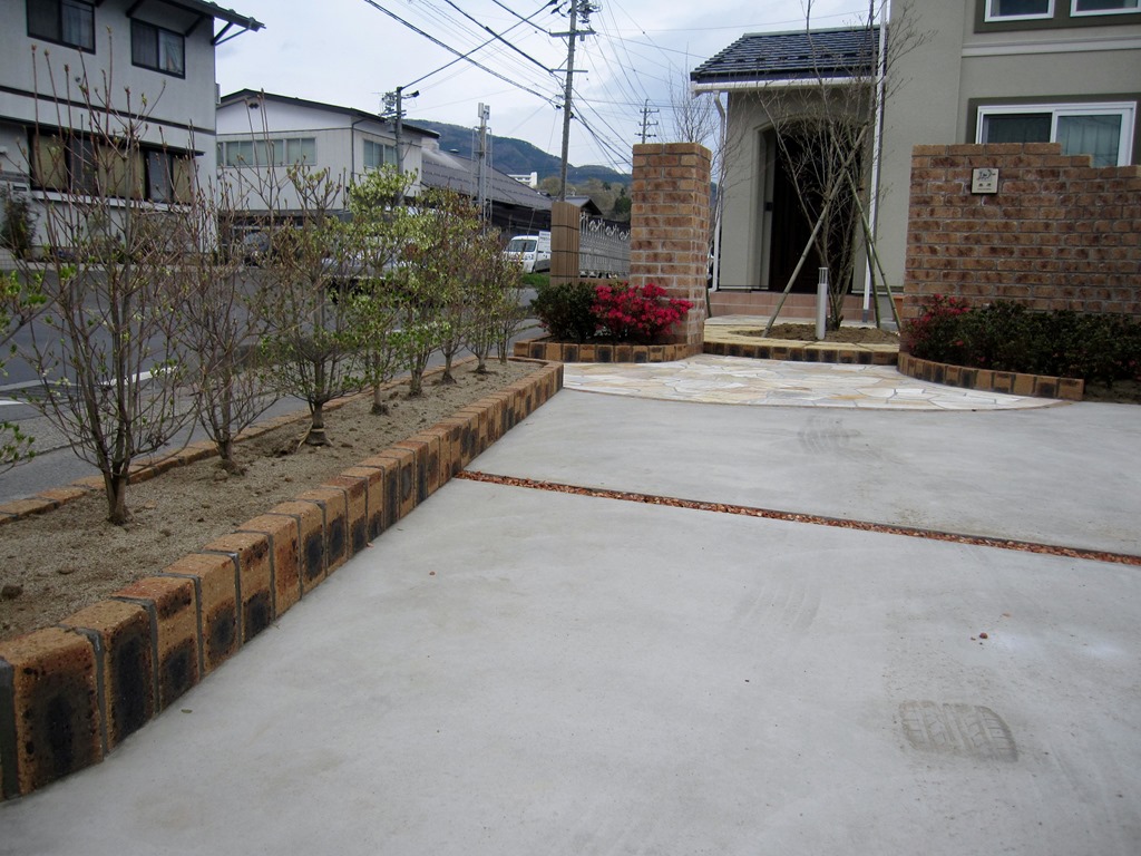 レンガの門柱と塀の手前には広い駐車スペースがあります。レンガを綺麗に見せるため、駐車場のコンクリートの土間に模様や色は付けていませんが、目地にはテコラを入れています。そして道路側には、レンガで低い花壇を作り、ドウダンツツジを植えこみました。