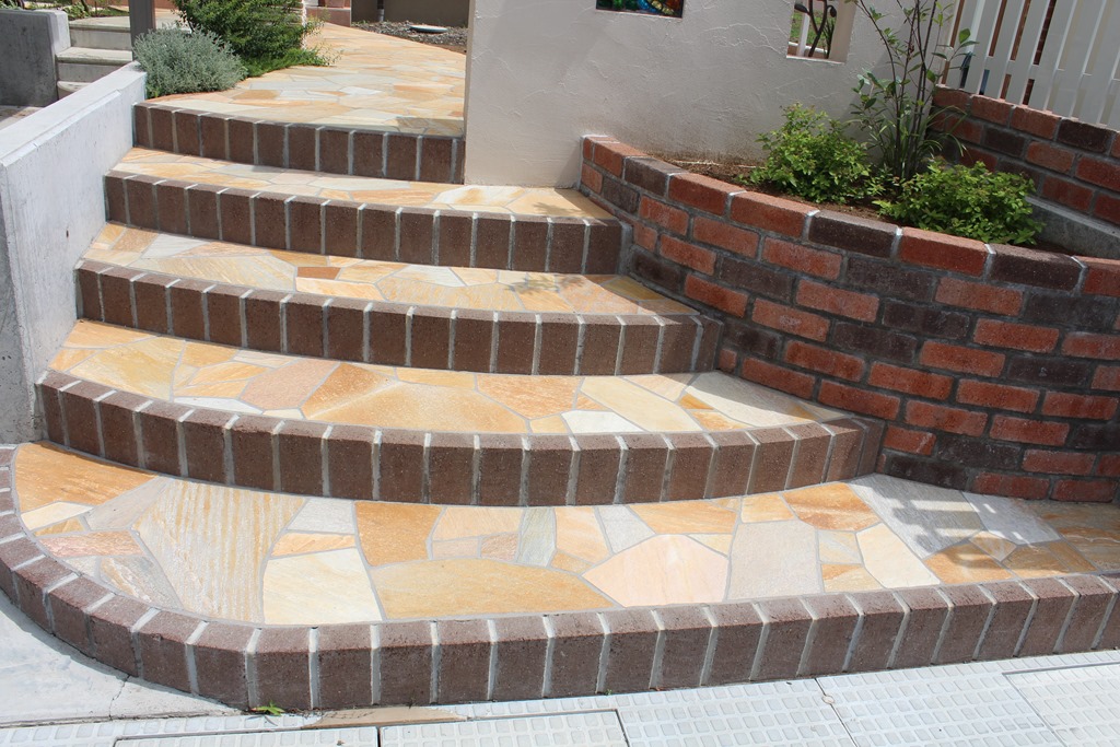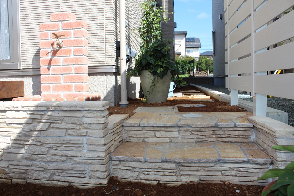 門柱と、リビングの前の土止め・裏側に行く階段をブラッドストーン・マドックZのジロンデで施工しています。ガーデニングが好きだという人にはお勧めしたい英国製のブラッドストーンは植木・宿根草ともとても相性の良い商品です。