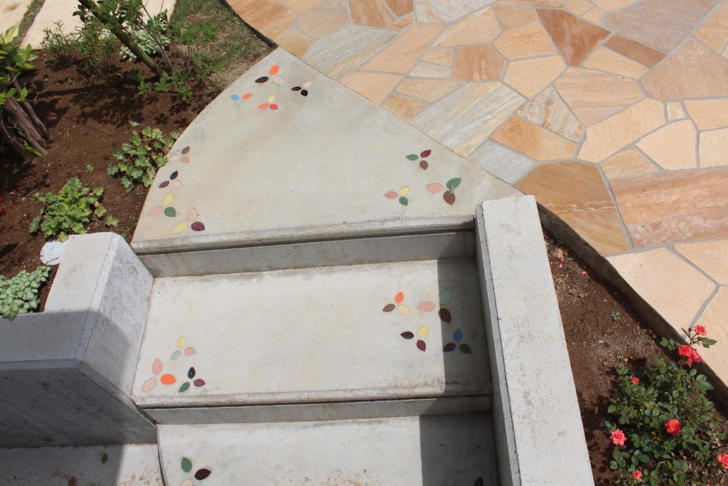 敷地が高いので、レンガを縁にして5段の段を曲線状にして施工して天然石を貼った通路は、階段を上ってから玄関までの距離も緩やかなカーブを描いてデザインしています。駐車場の後ろ側にも階段を設けていて駐車場からも入り易くデザインしました。 そこに作られた階段にはお客様が用意してくれた葉っぱの形のタイルを貼っています。
