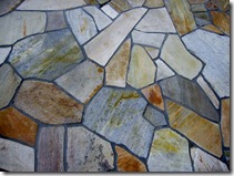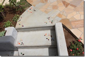 門柱の間を通り玄関まで続く通路は天然石を貼り、途中にブラッドストーンのサークルを入れています。その日の気分でサークルの右側左側の好きな方を歩くことが出来ます。