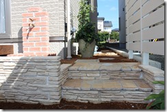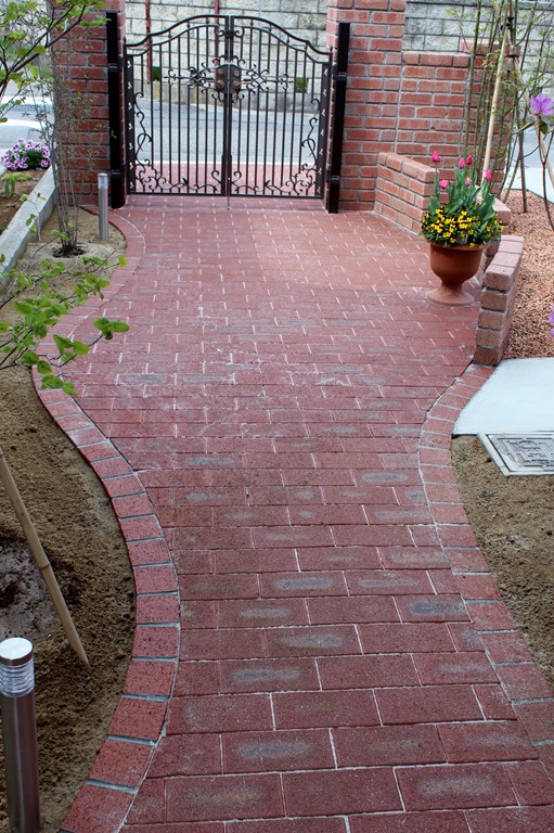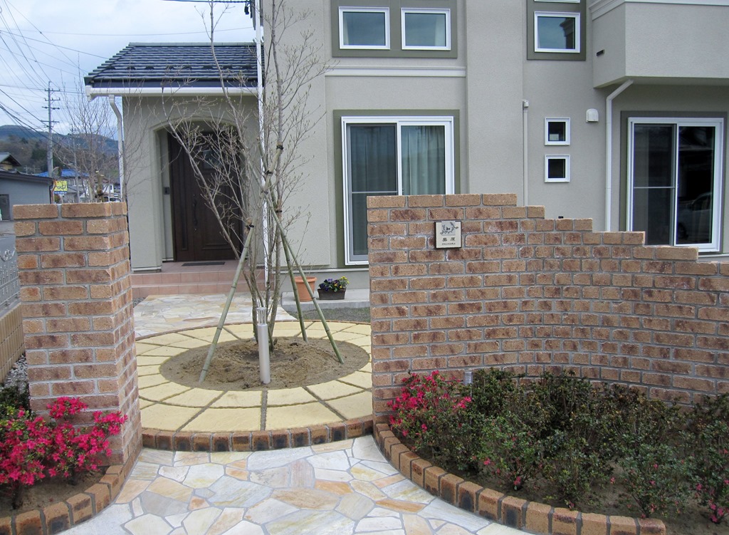 レンガを沢山積み上げた現場です。右側のレンガ門柱は、前後左右に曲線を描いています。反対側は角柱のレンガ積みです。門柱のすぐ後ろにはシャンブルズサークルを作り、左右どちらからでも玄関に向かう事が出来るようにしています。センター部分を土で残し、シンボルツリーを植えています。サークルを挟んだ前後は、天然石を貼った通路にしています。花壇は低くレンガを立てて作っています。
