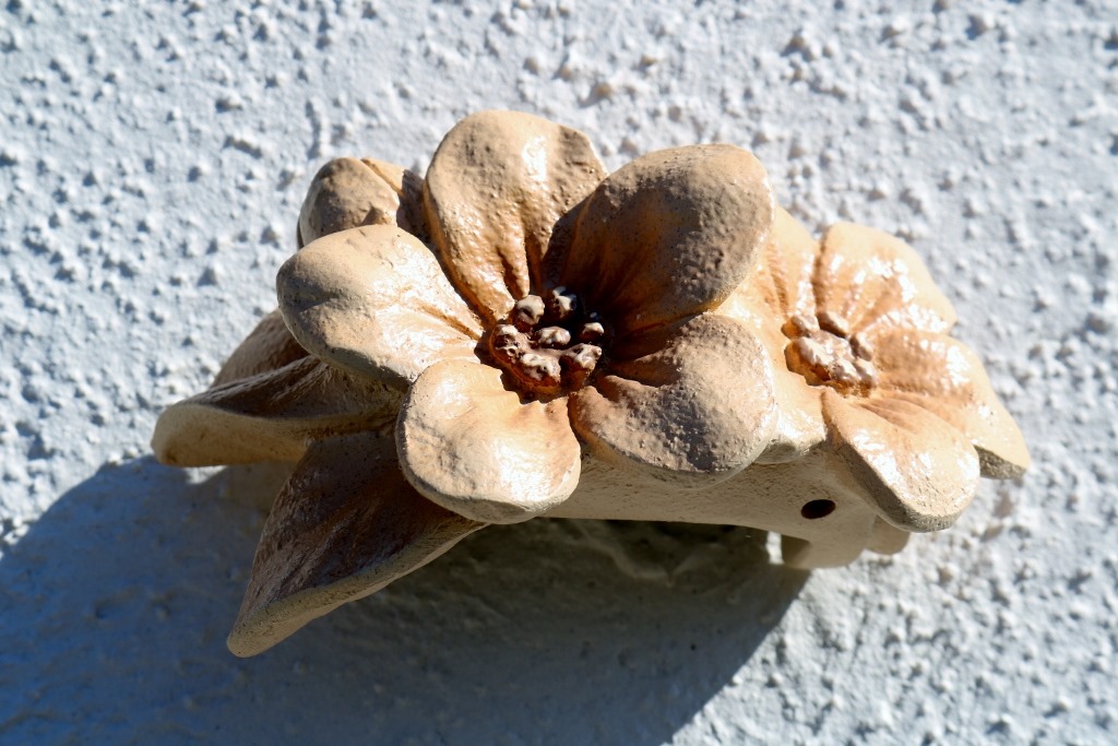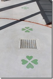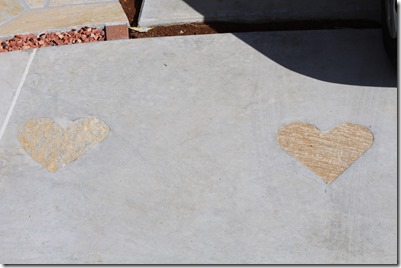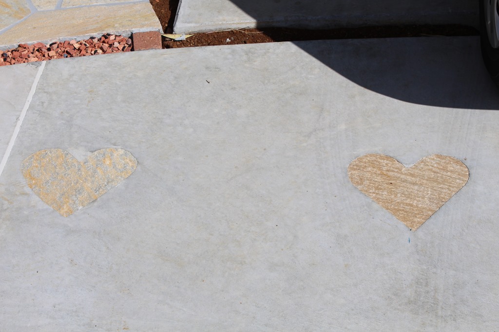 駐車場のコンクリートの中に天然石を加工して作られたハートとクリスタルグレイン(粉砕ガラス)で作られたハートで四葉のクロバーのデザインにして埋め込んでいます。 床にワンポイントデザインがあるだけでも充分素敵に見えてきます。 エクステリアは少し工夫するだけでも楽しく素敵に仕上がります。