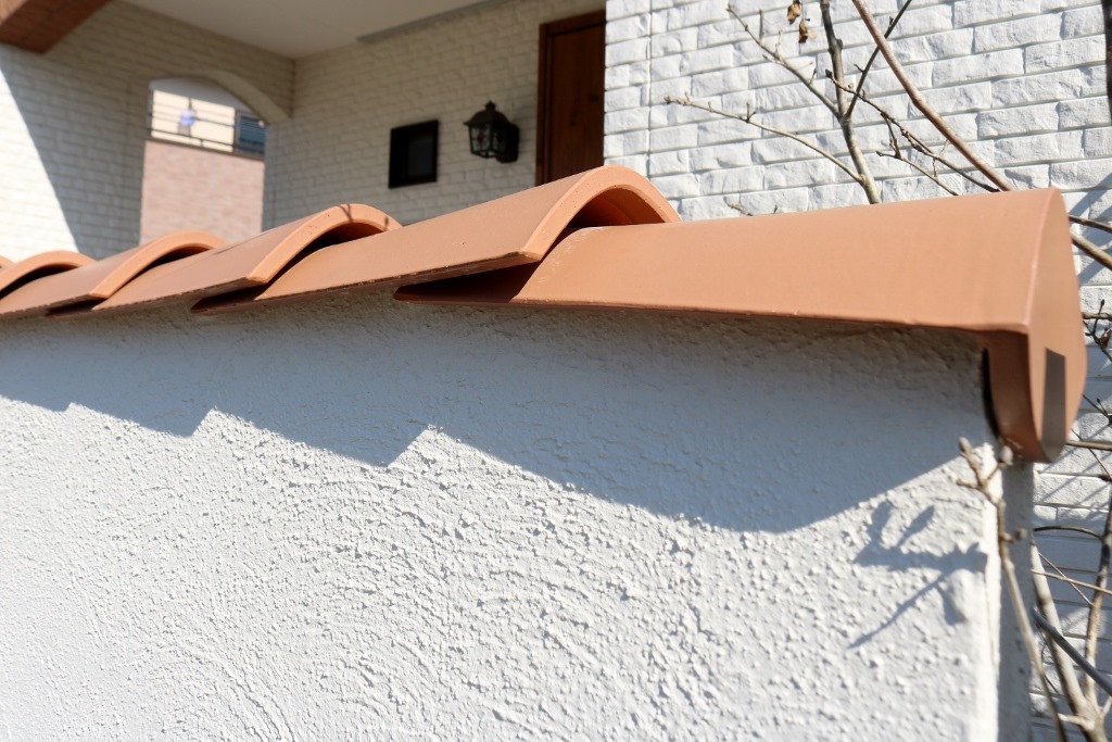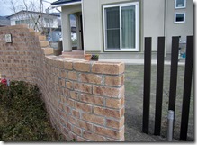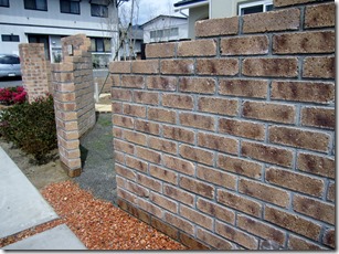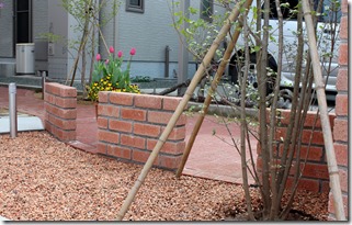 門柱から続くレンガの塀は長いです。高さを変えながら、途中で隙間を開け、少し下がった場所に、アルミポールを立てて塀代わりにしています。手前の駐車場の土間コンクリートとの間には、テコラ(破砕瓦)を敷きこみ、レンガ塀にドロ跳ねを防いだり、見た目にも綺麗です。