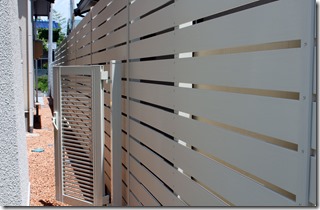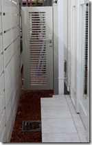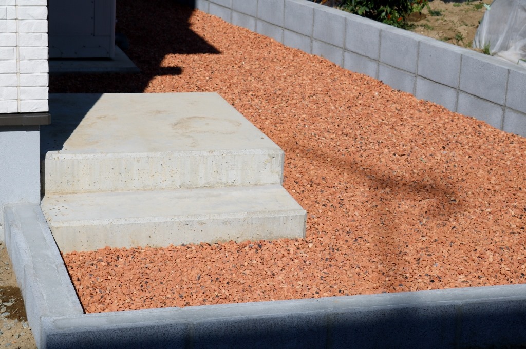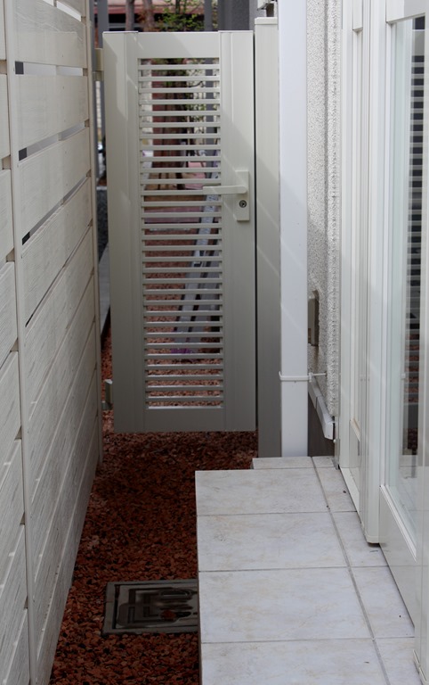 建物の両側の庭に行ける通路には、愛犬が飛び出さないように高さのある扉を付けました。床は防草シートを敷き、その上からテコラ(破砕瓦)を敷きこんでいるので、雑草対策以外に、汚れ防止・また防犯効果もあるので防草シート&テコラはお勧めです。