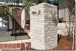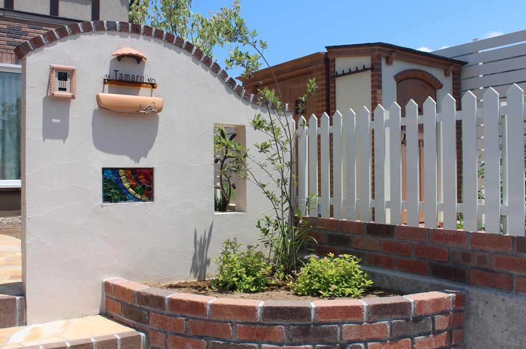 門柱の天端を曲線にして塗塀で仕上げたエクステリアの現場です。塗り壁にサインをG-04アンバー色のガラスバーにステンレスの切り文字が付いていてピンの色、サイドのデザインを選べる表札に、陶器風に見える表札灯・ポストはポーチFオレンジでインターホンカバーC-13スリットにRフィックスフェンス2型02-06があります。ポストの下にあるのは当社オリジナルのダルで作られたステンドです。道路側の基礎の上にレンガを積みアメリカンフェンスを取り付け、裏側はブラッドストーンで花壇を作り、カンナ物置の前には、ブラッドストーンでサークルをデザインしています