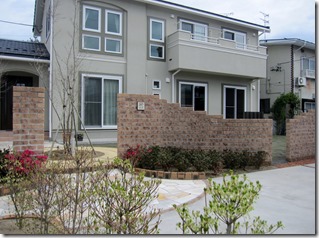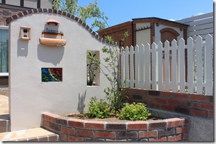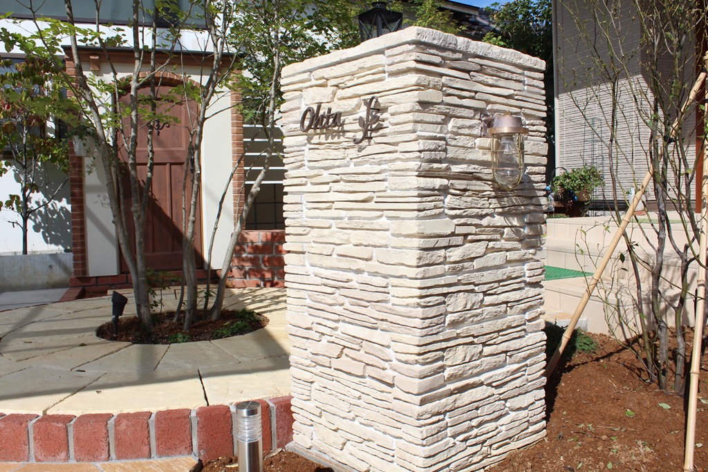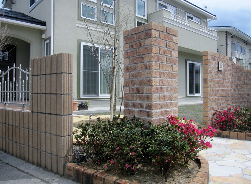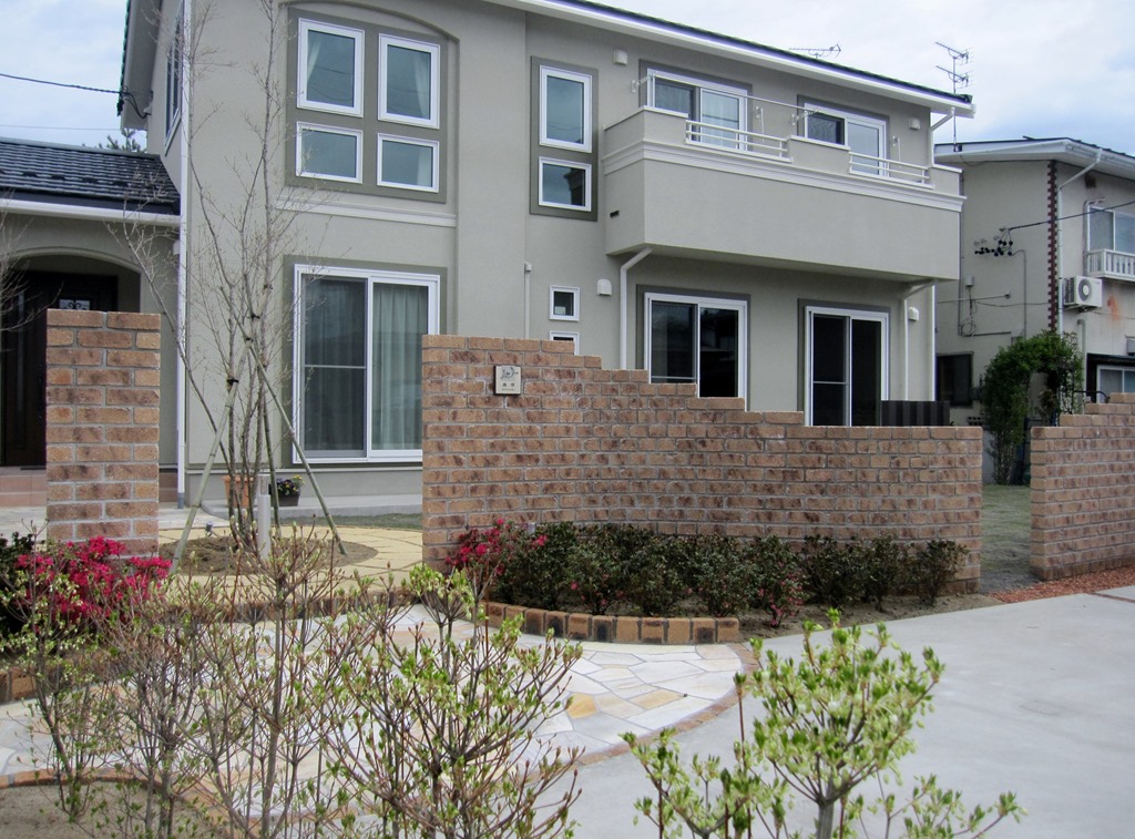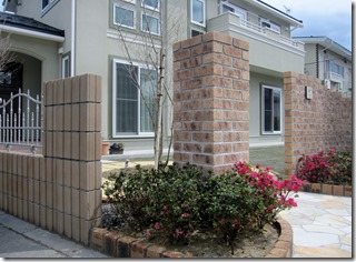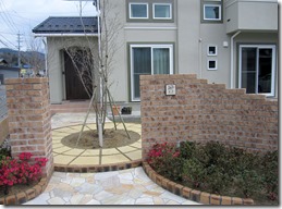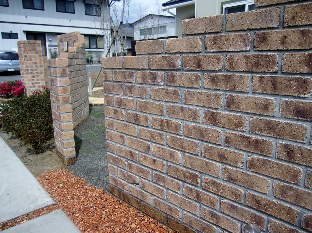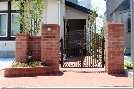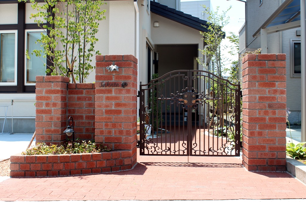 南側が正面になっていて、レンガを積み上げた角門柱と塀に続くレンガの壁の門柱をデザインしました。