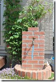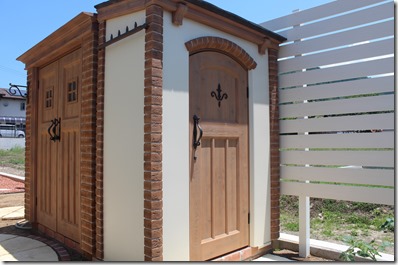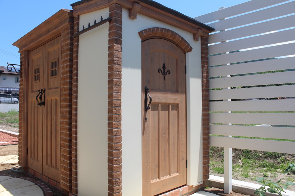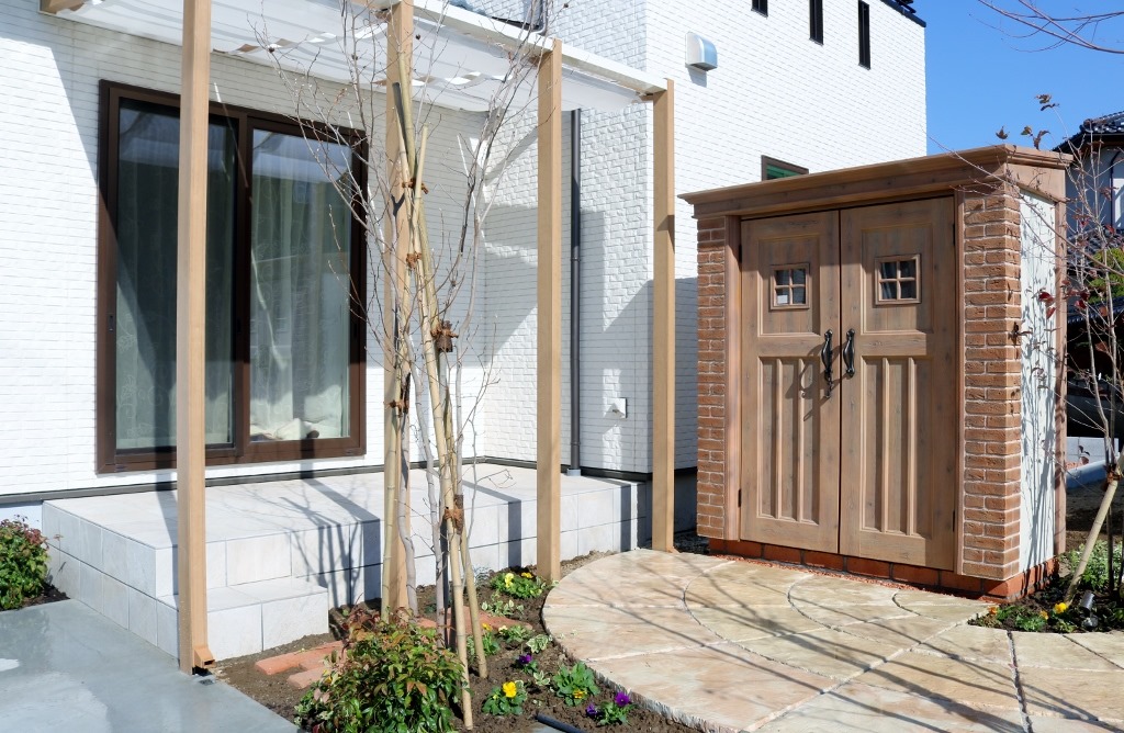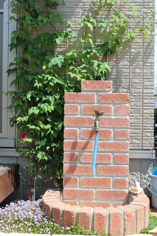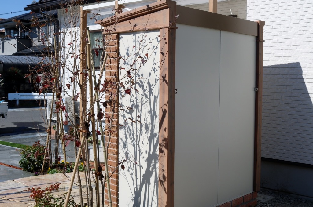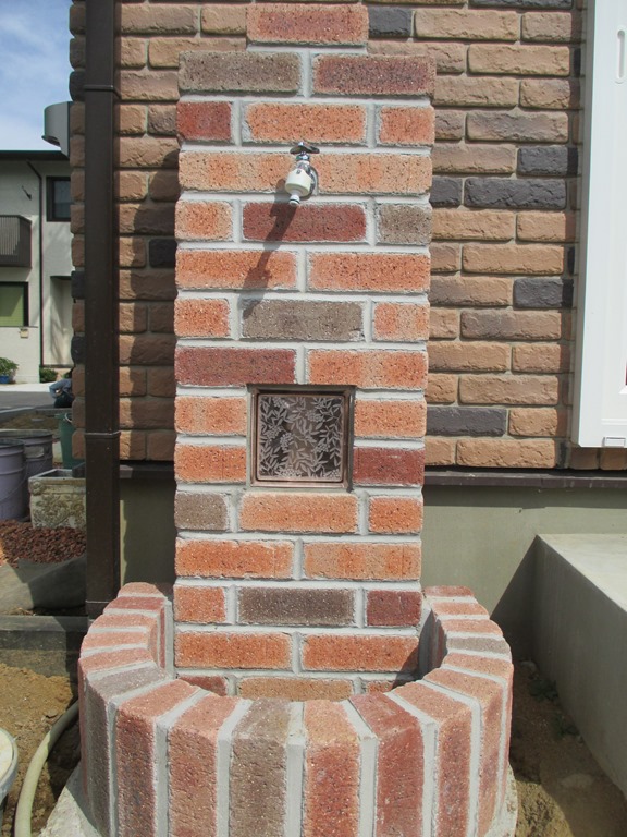 不凍栓の前にレンガを積み上げ蛇口も交換して水受けもレンガで囲い中は防水モルタルで仕上げています、東側の境界にカンナ物置とカンナキュート物置が建てられ背景にアルファウッドで物置た同じ高さで施工しています。 当社はリピーターが多いです。この現場もこれからリビングの前にココマガーデンルームⅡを取り付ける予定になっています。その時にスタンドウォッシュリリーの取り付けも行います。