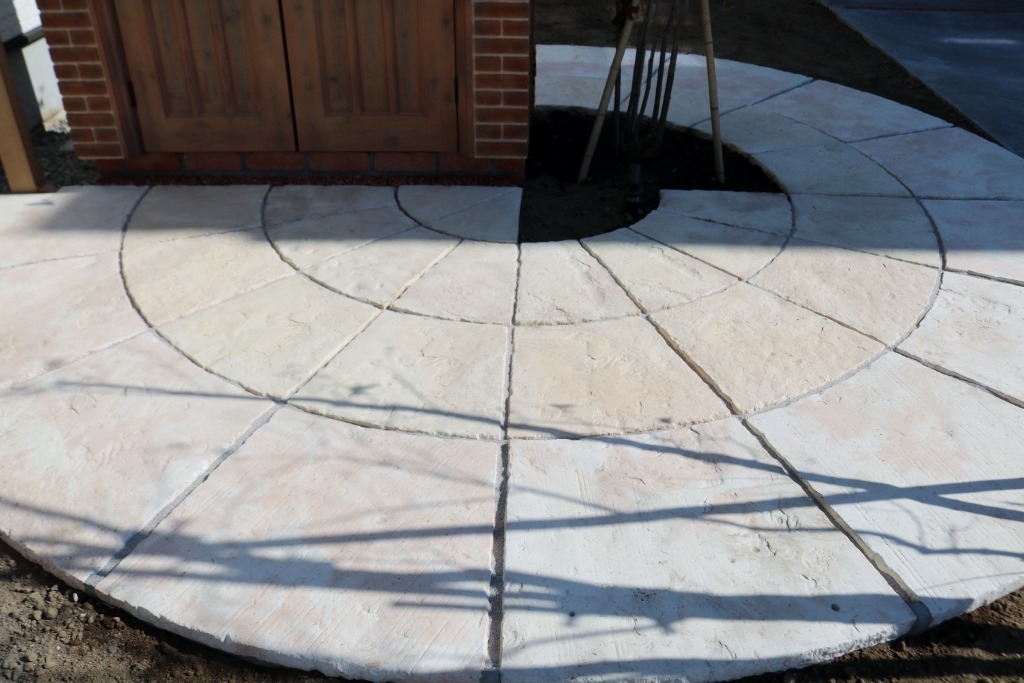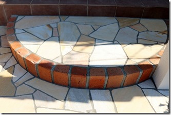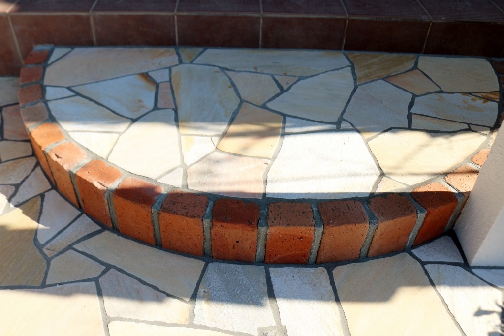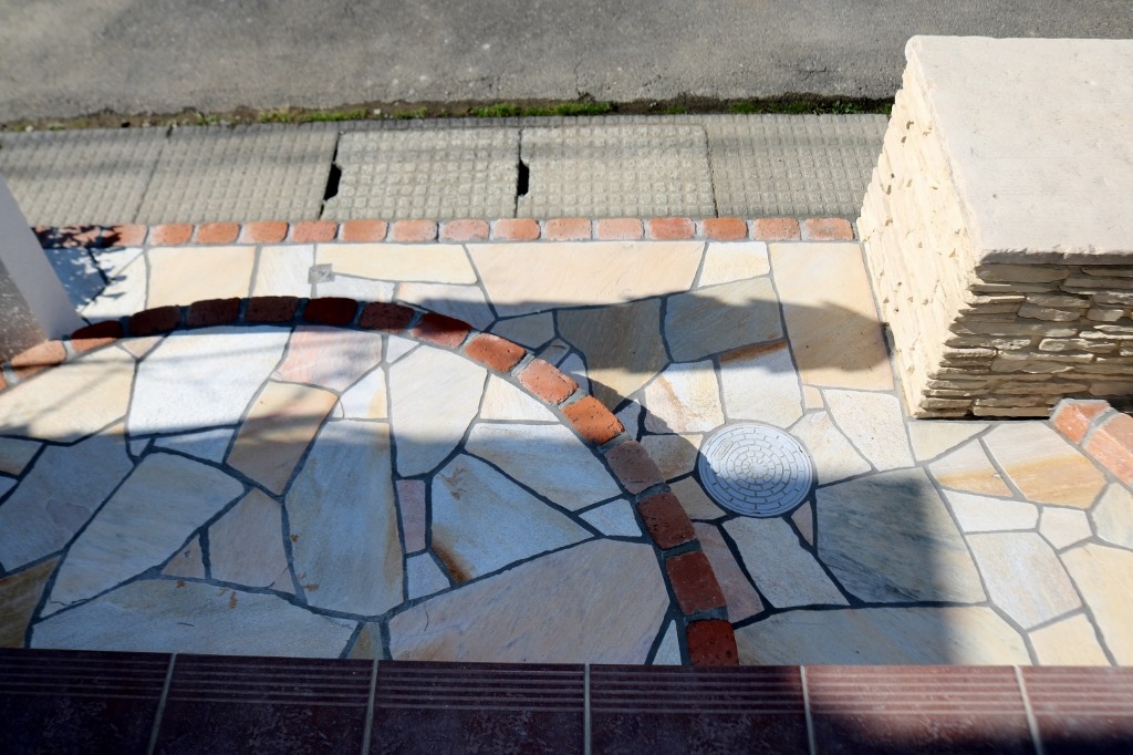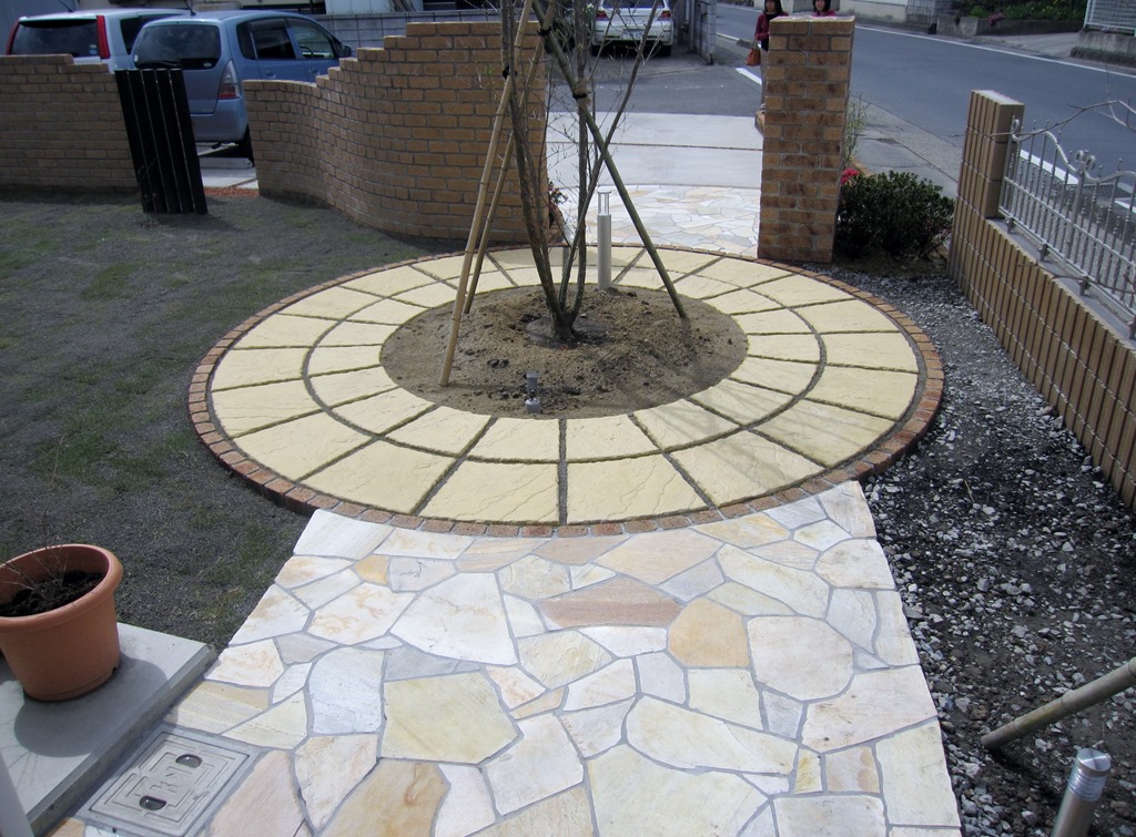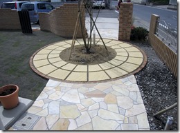 玄関前に作られた、オールドターン・パーチイエローのサークルの縁をレンガで囲い、より鮮明にサークル・天然石の通路が見えるようになりました。