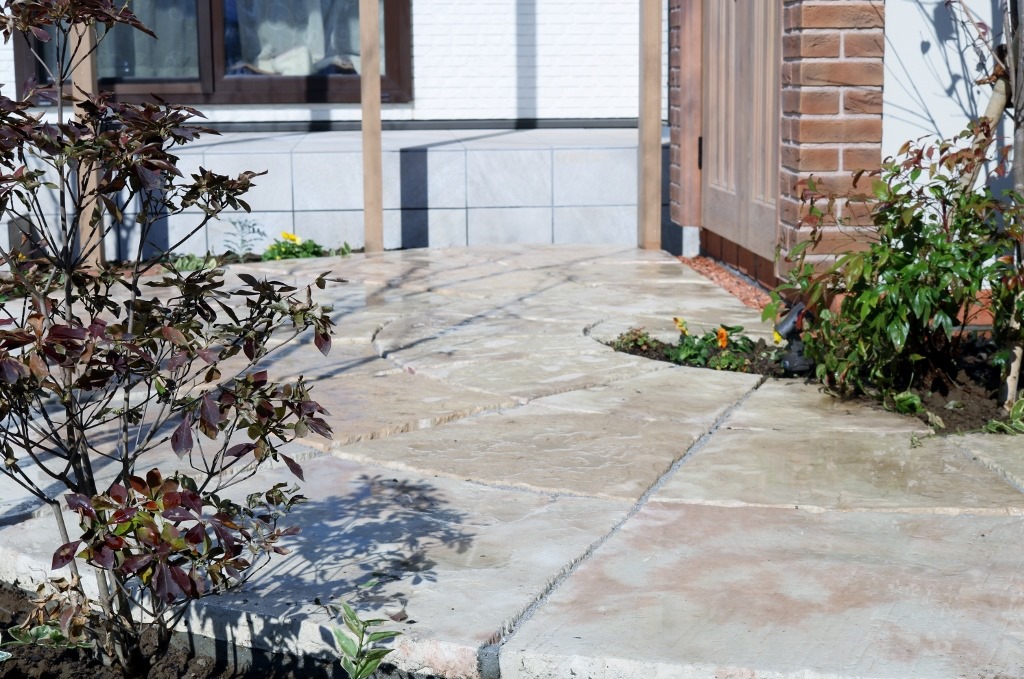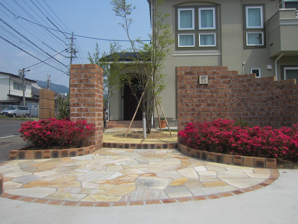 玄関から見たアプローチは、ブラッドストーンサークルを挟んで天然石を貼っています。サークルの縁にレンガを立てているのでサークルがより綺麗に見えています。天然石のイエローとも違いがあって素敵です。広い庭スペースには高麗芝を貼っています。