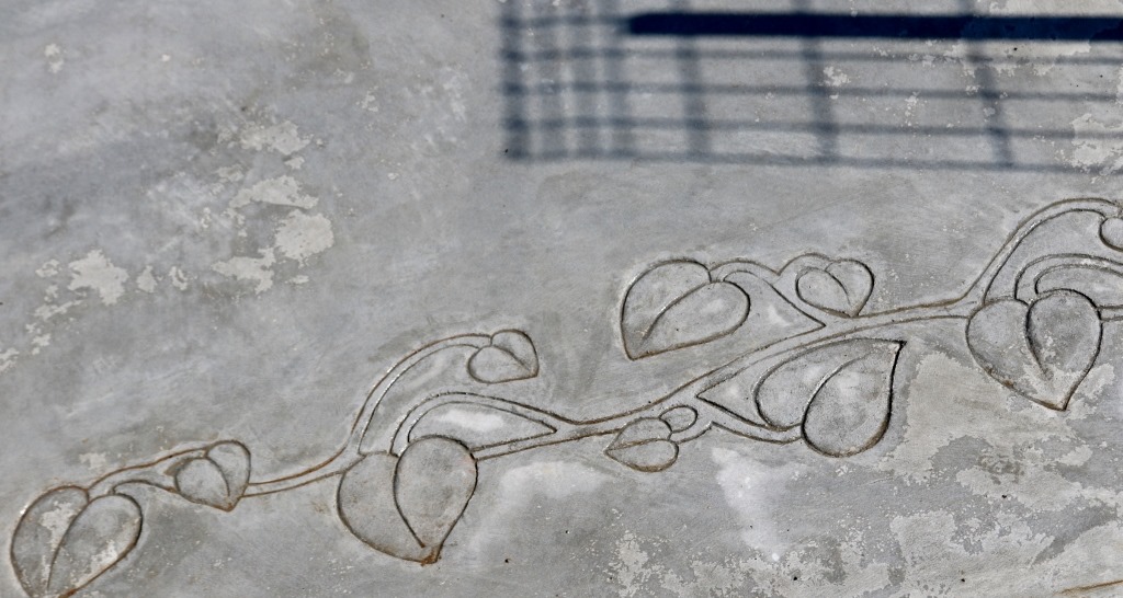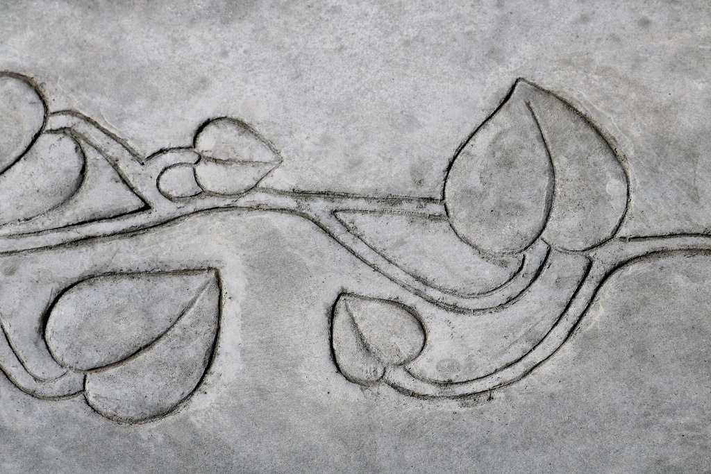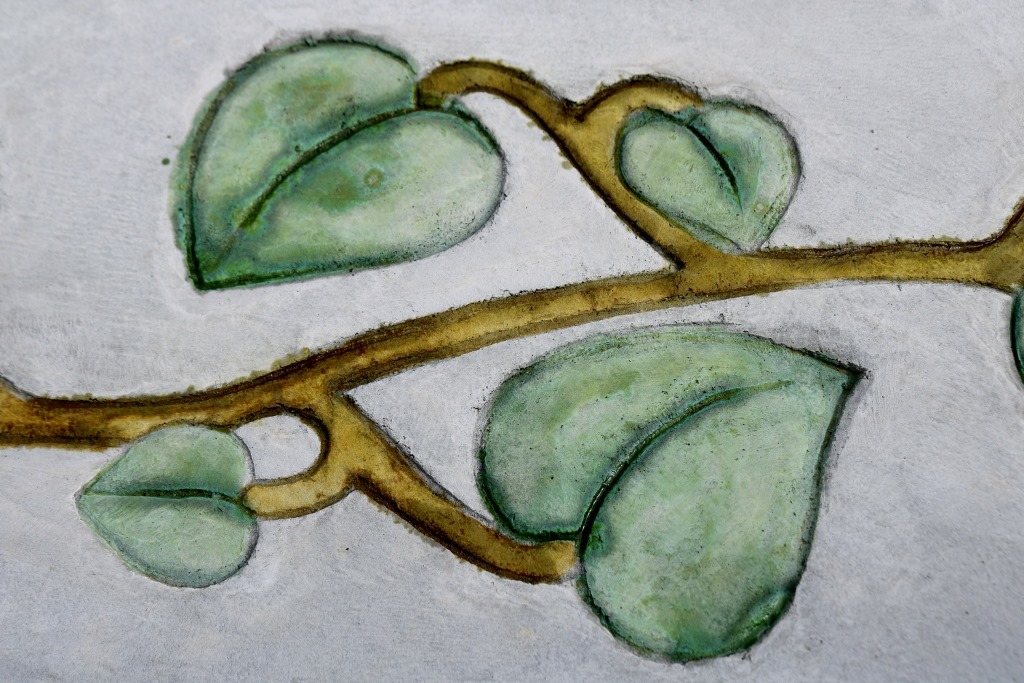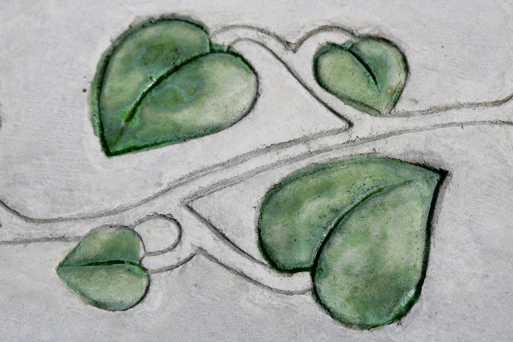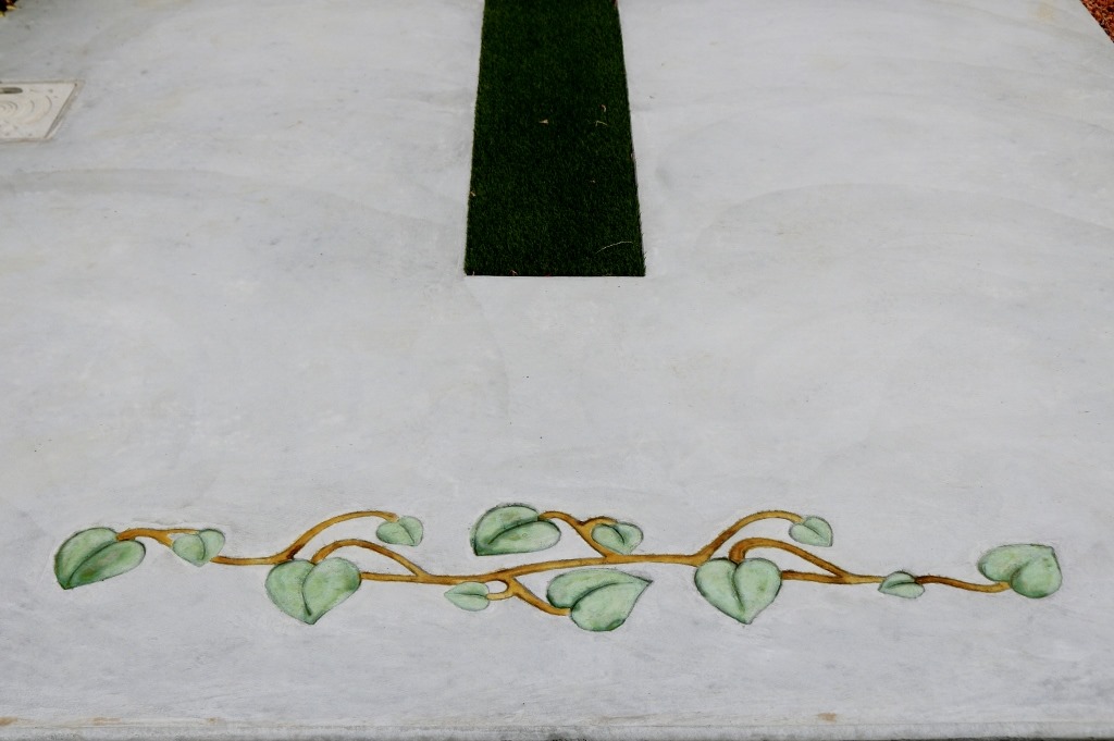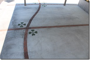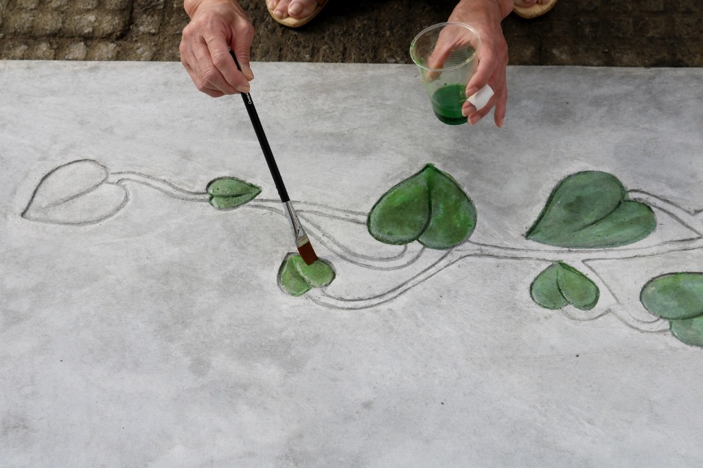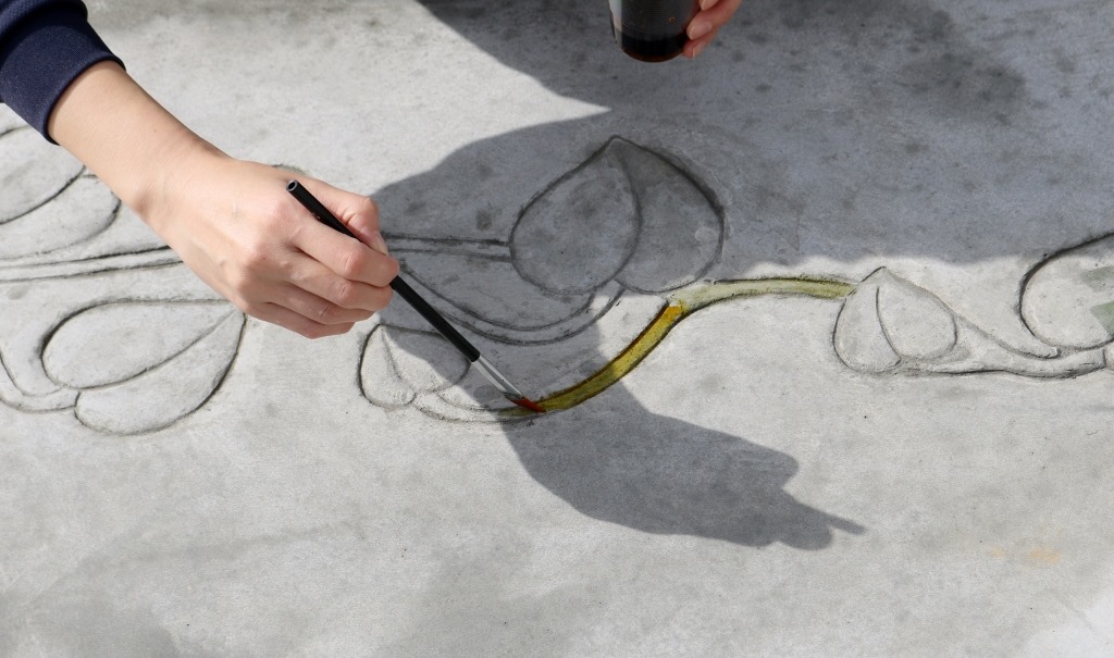 駐車場のコンクリート床に、ボーダーアートでアイビーの形押しをした場所の色付けをしました。 ステインのブラウン・グリーンの2色で色付けです。 コンクリート表面を良く綺麗にして水洗い、水分をふき取ってから、ステインを水で薄めて筆で色付けしていきます、ペンキと違いコンクリートとステインの科学反応で色付けをするので仕上がりもペンキとは様子が違います。