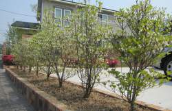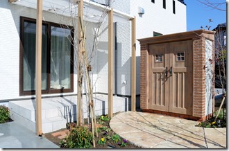 西側がいちばん奥になります、ガレージと背中合わせの突き当りの空間にお洒落で可愛いカンナキュート物置を建てました、カンナキュートの後ろ側にはカンナと同じ高さで樹脂板のアルファウッドで塀を作っています、庭がよりいっそう素敵に見えます、サークルから物置に向かうときには白いアーチを潜っていきますが、来年になると横に植えられたキングサリが素敵なトンネルになってくれるでしょう。
