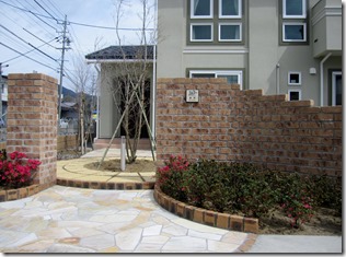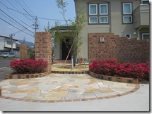 道路から玄関までの距離があまり無いので、巾を広くして縁をレンガ立てで天然石のイエローを貼ったアプローチ。天然石は飽きの少ない工法です。門柱と反対側に英国製擬石のブラッドストーン・マドックZで角柱風にしてアクセント天端にブラツドストーンの平板60角ジロンデ。