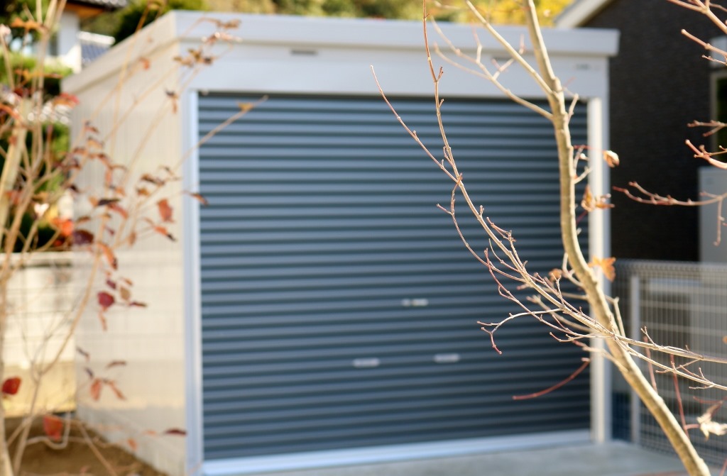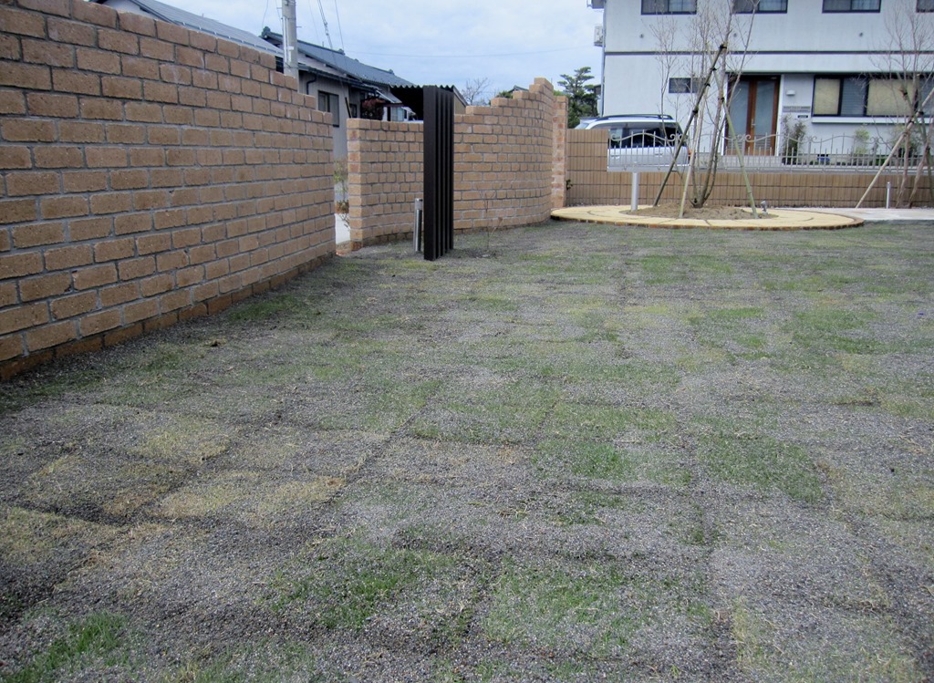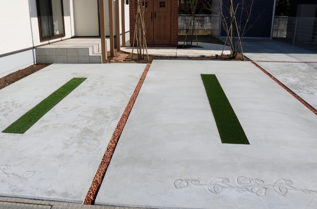 駐車場は、並列に3台ともう1台分の広さに奥に大き目のシャッター付きバイク庫、駐車場コンクリートの目地は破砕瓦テコラを入れて車の真下に人工芝を貼り付け庭が明るい感じに見えるように施工しました。