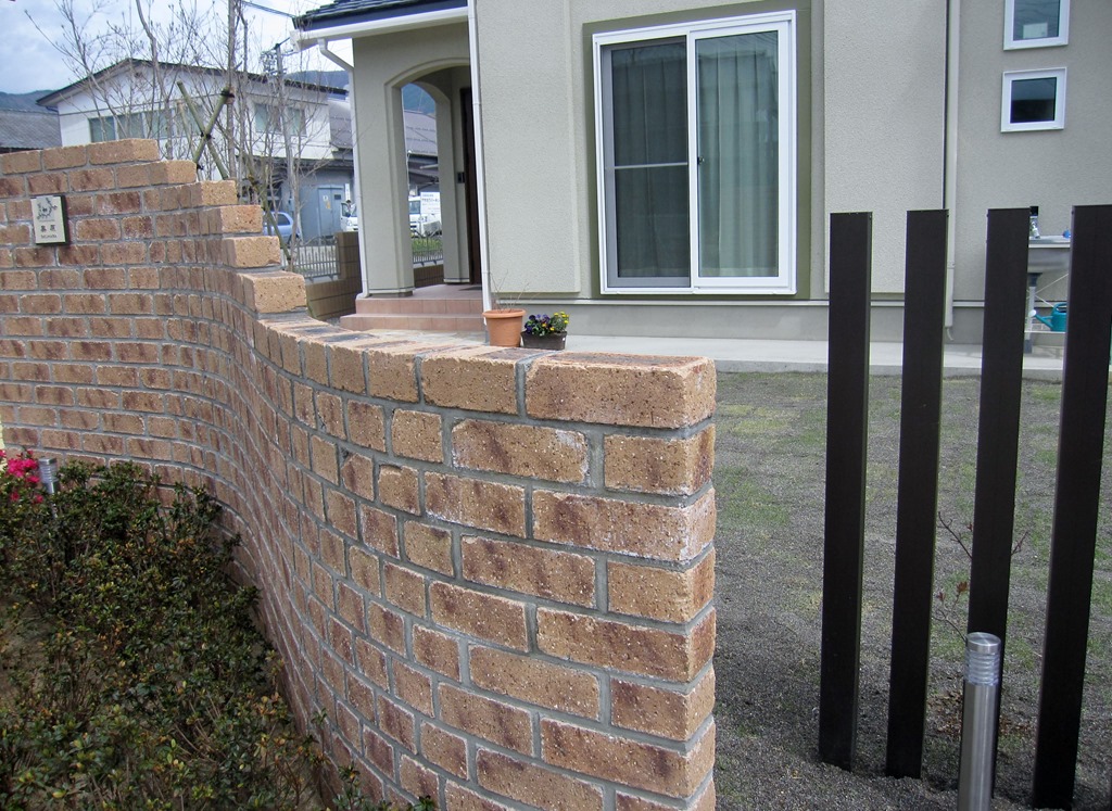 門柱から続くレンガ積みの塀は、広い駐車場との間に塀になるように積み、途中にポールを立てて変化を持たせたデザインになっています。高さに変化を持たせ曲線に積んでいく手間の掛かる施工。