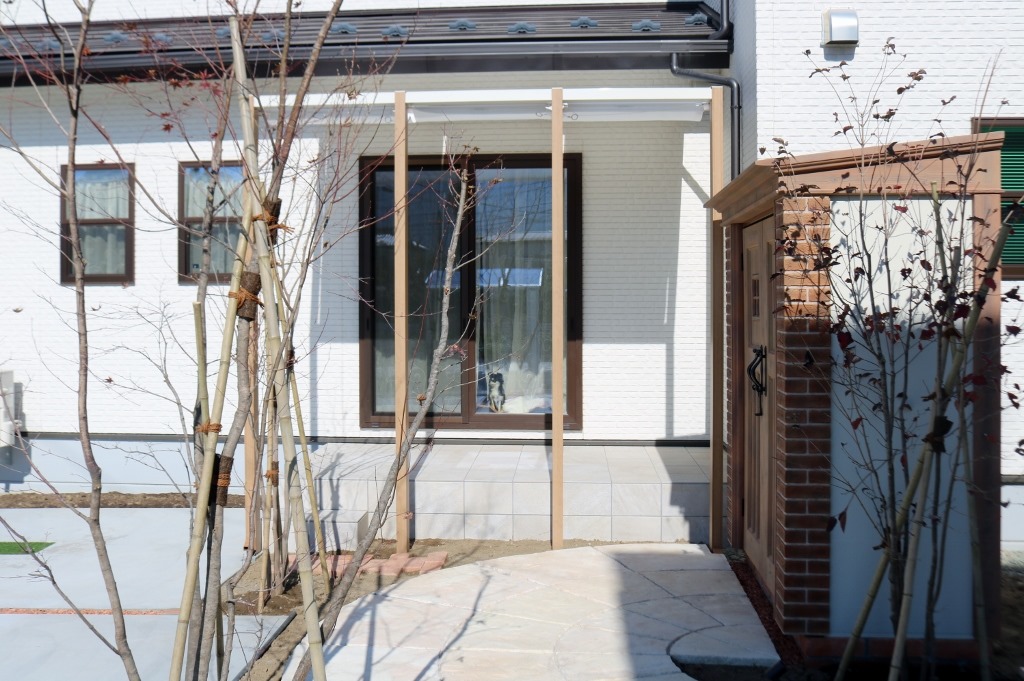 門扉を開けて玄関までの通路も煉瓦を敷きこみホワイトカラーと煉瓦カラーが良く合うエクステリアデザインです。