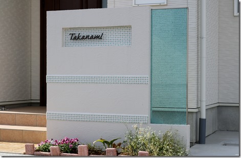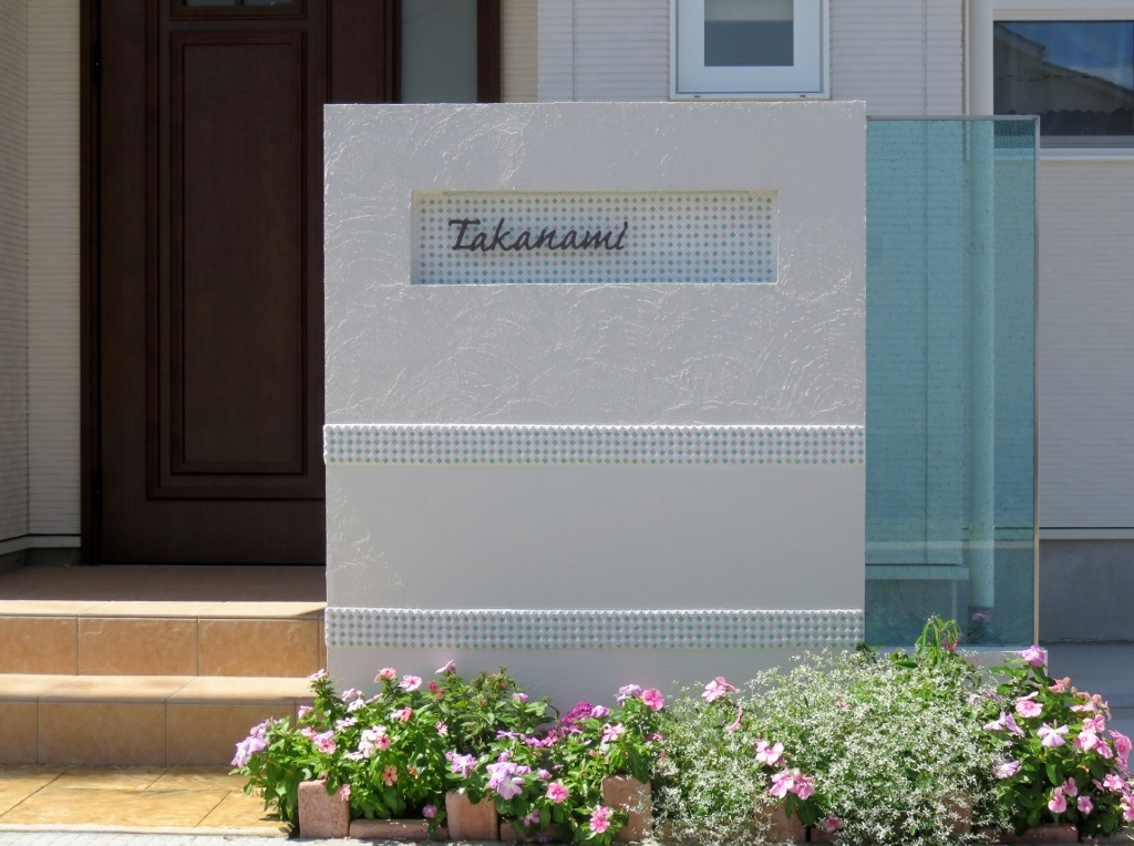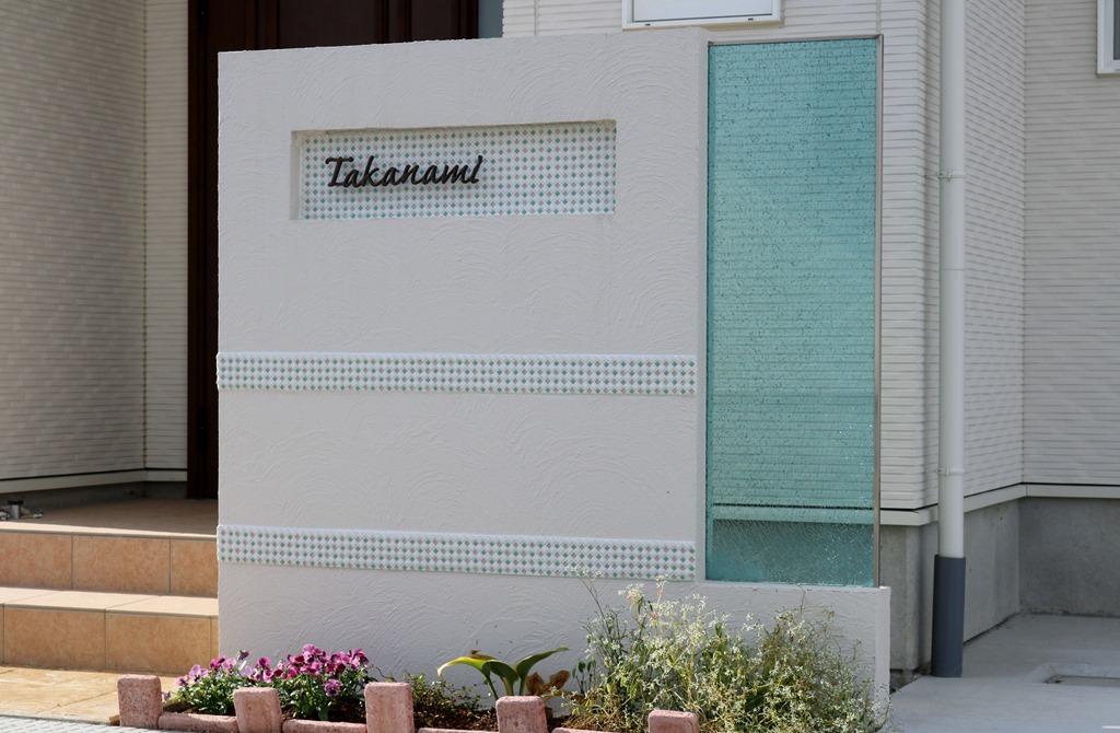 カラージュエルグラスのブルーを取り付けた門柱は、門柱に貼られたモザイクタイルもあり、優しく見えてきます。