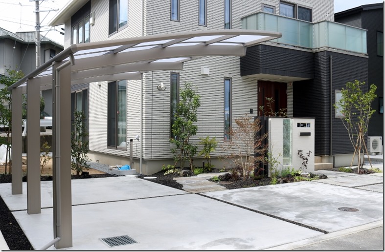 駐車場のコンクリート目地もtoledoおりじなるの目地ラインで大和桜を仕様しました。 庭管理が苦手と言うので、植栽を少なくして防草シートを敷き込み破砕瓦テコラを敷き込んでいます。カーポートの横にイナバ物置を2棟並べています。