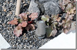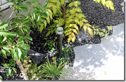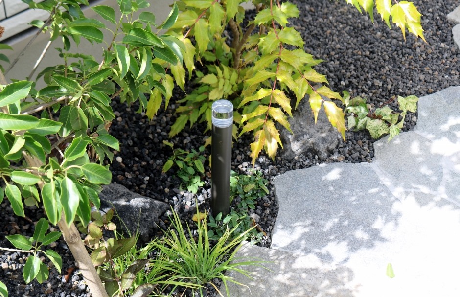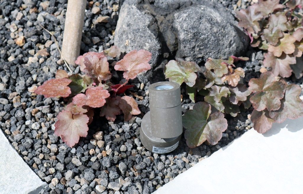 門柱の正面にガーデンポールライト、ジュエルグラスの後ろ側にアップライトを設置して点灯させています。