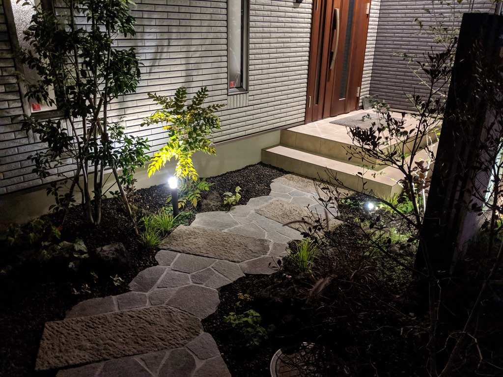 夜になると自動点灯でエクステリア照明が点灯します。門柱前花壇の美彩ローポールライト、門柱の後ろからジュエルグラスに美彩スパイクスポットライトが明るくしています。