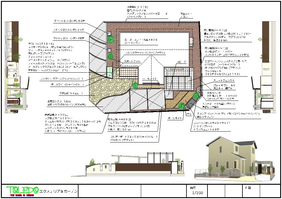 お客様と打ち合わせをして、希望を取り入れたうえで、おまかせで外構デザインをしました。 駐車場と建物の建つ敷地との高低差があるのでジョリパット塗仕上げの門柱前に天然石貼りの階段を扇状に作り、駐車場の後ろは基礎で留めをして化粧ブロックを積み樹脂板フェンスを施工して、できるだけ植栽を多く植え込みまとた。