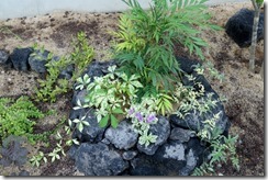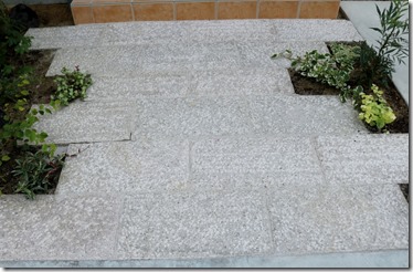 屋根があり、雨の当たらない場所の坪庭はブラッドストーンの平板と浅間の軽石で作り外側には樹脂板アルファウッドのアイボリーで目隠しを兼ねてハンキングで出来る状態を作り、御影石の水鉢の中に水の代わりにリコストーンのクリア・ブルーを盛るようにして入れました。