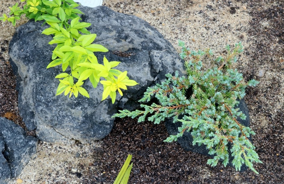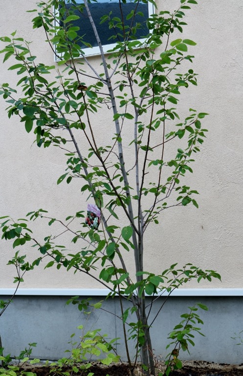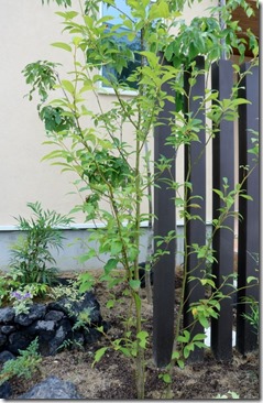 門柱の裏側にヤマボウシとシャラ・テラスの前にモミジとジュンベリー・お風呂場の前に目隠しを兼ねて常緑のソヨゴを植えました。