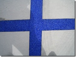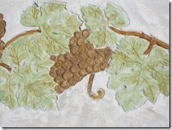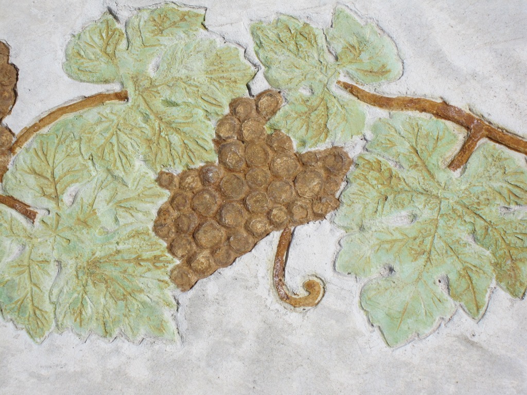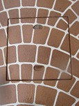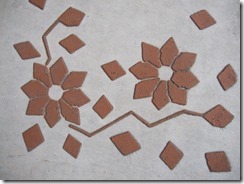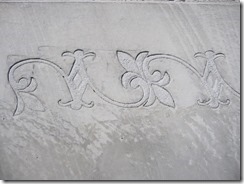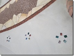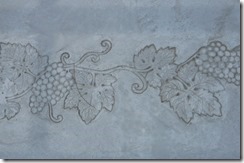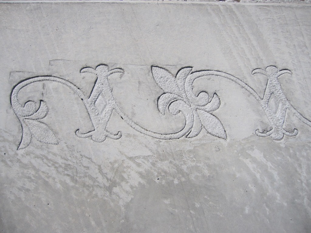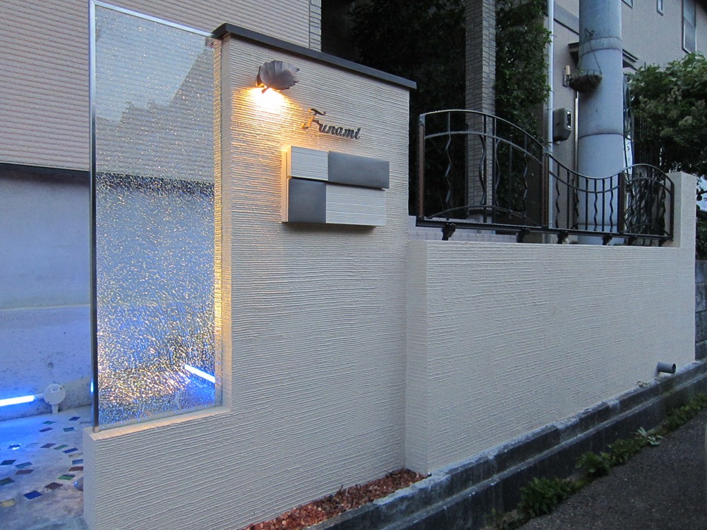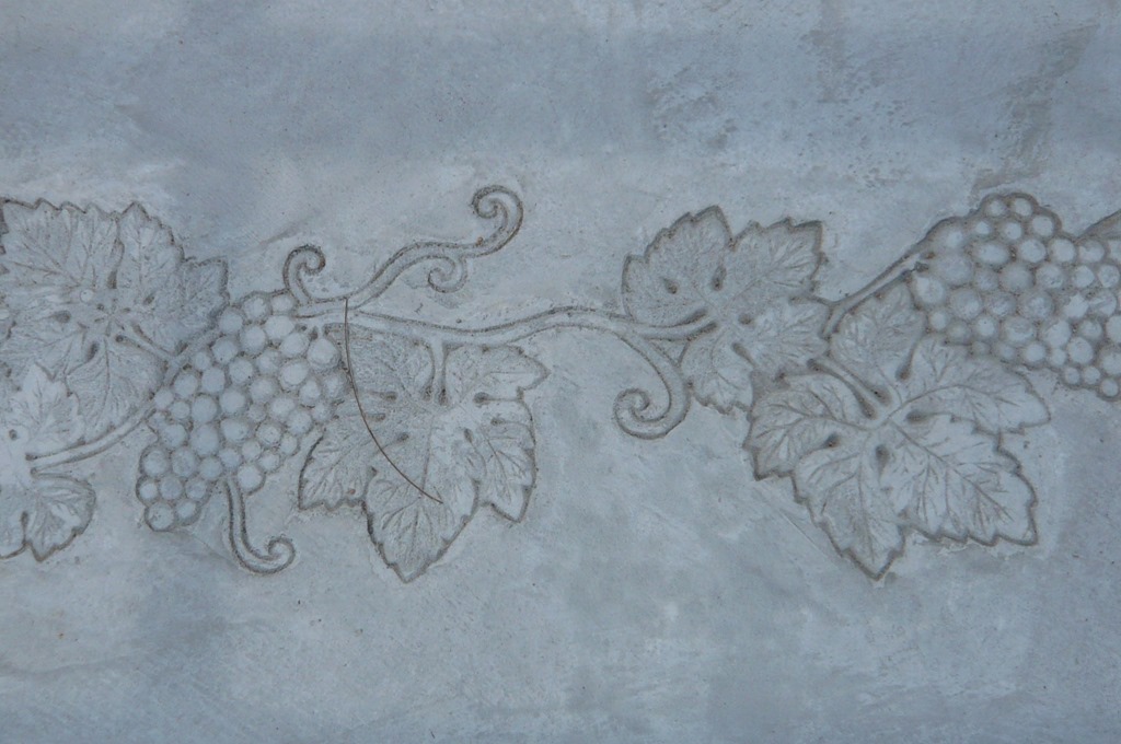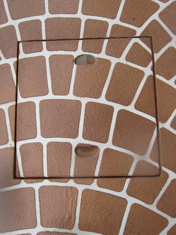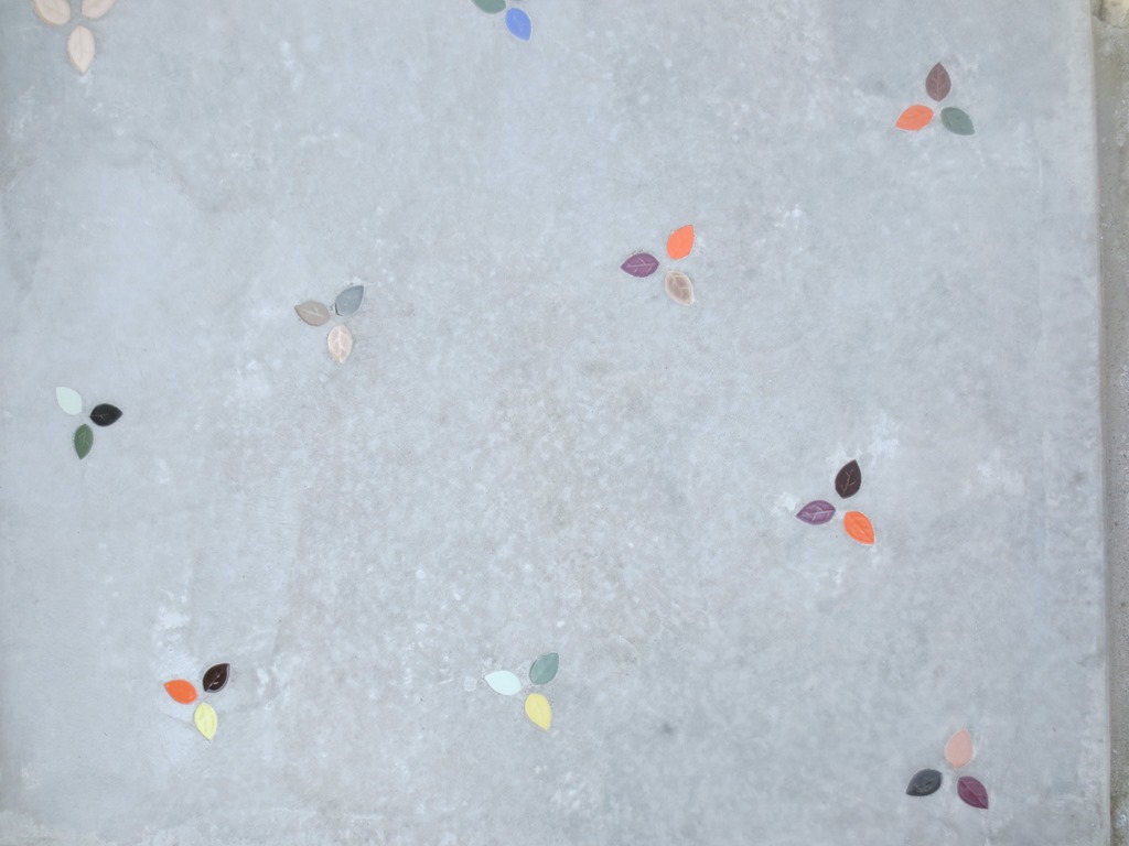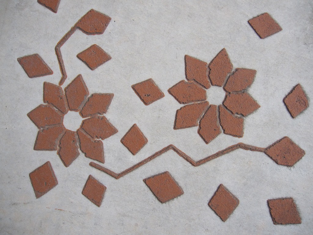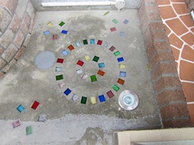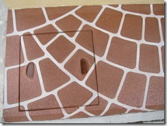 タメマスの蓋もパターンと色を付けた現場です、こんな風に仕上げられるのはスプレーガンで吹き付ける工法だからできる工事なんです。一旦ベージュ系の色を仕上げたい部分の全体に塗り、乾いてからステンシルを敷き吹き付けています、下地にも色が付いているせいで全体がクツキリと見えてまます。