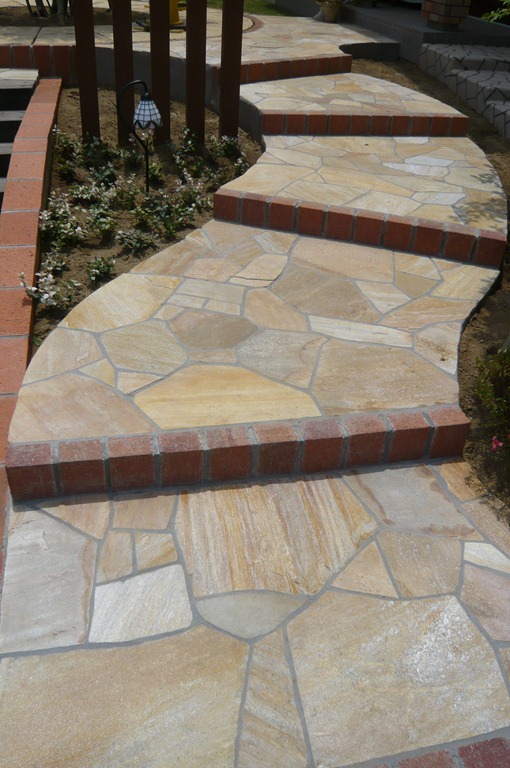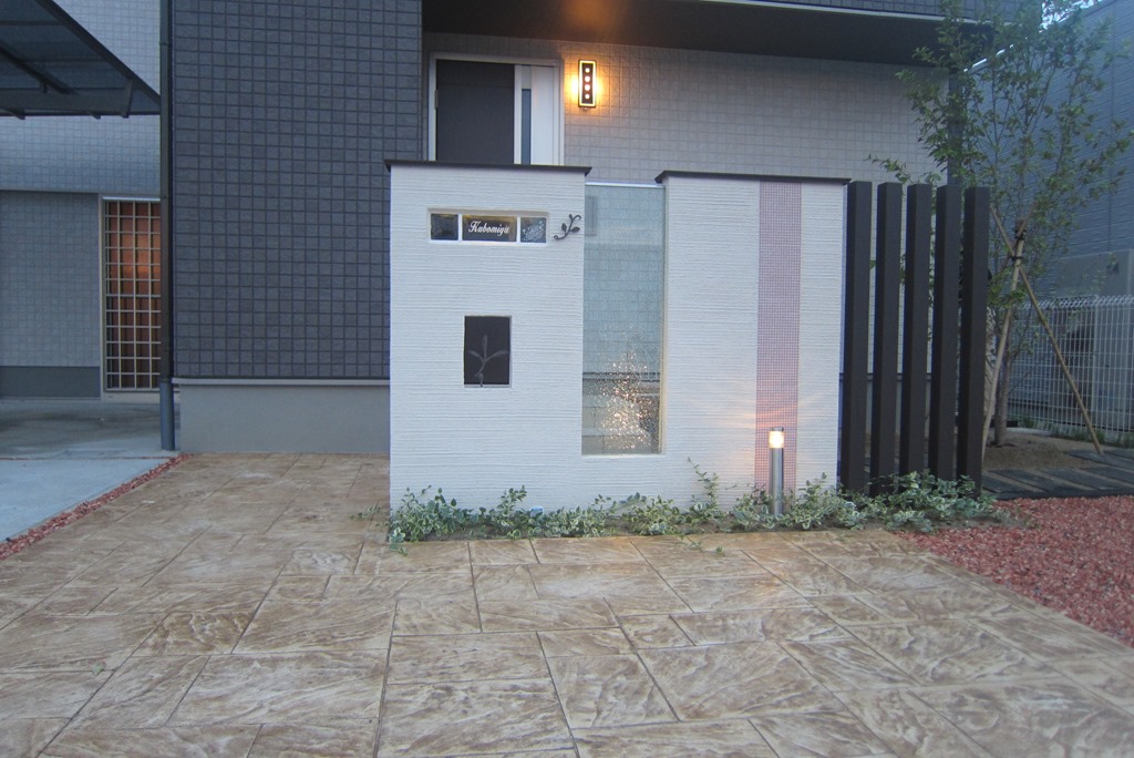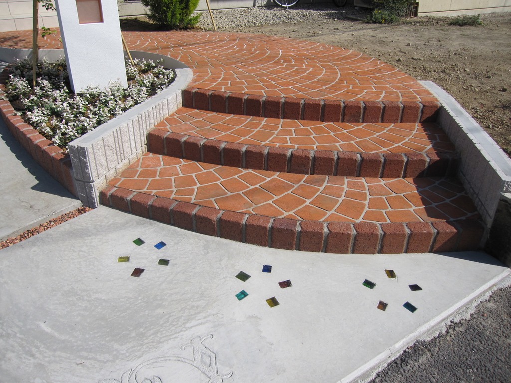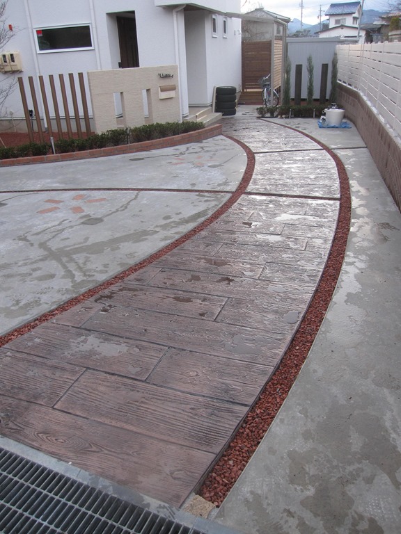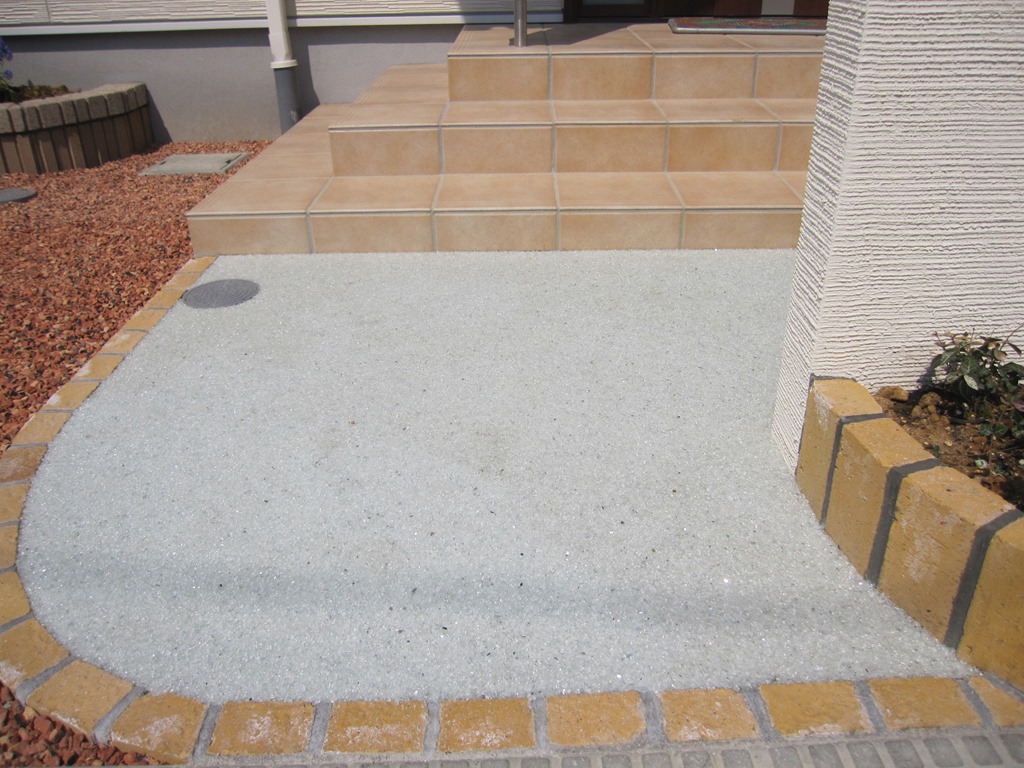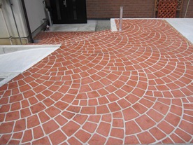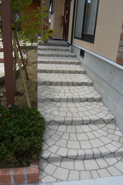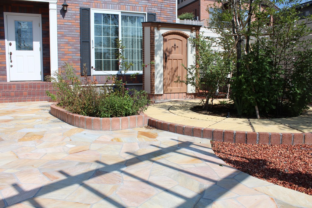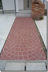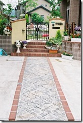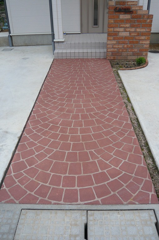 道路から門柱の横を通り曲線を描きながら続く通路を、HBサンドのカラーでヨーロピアンのパターンで仕上げた現場です。