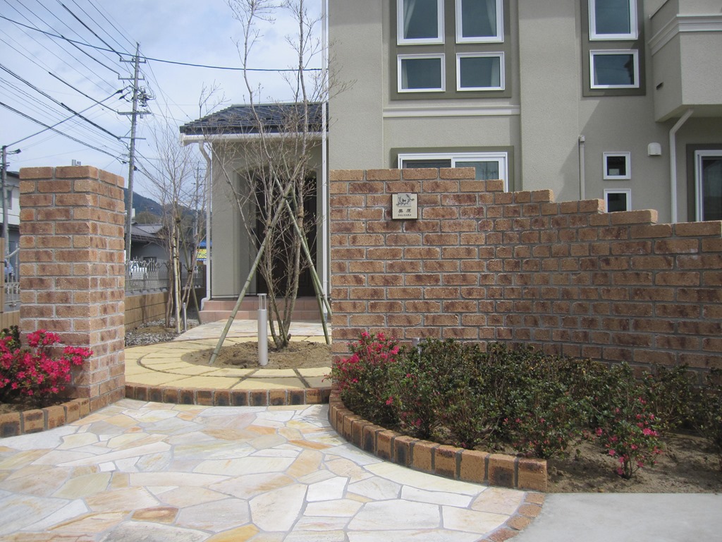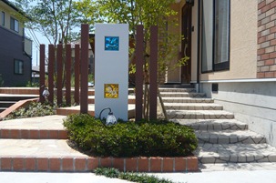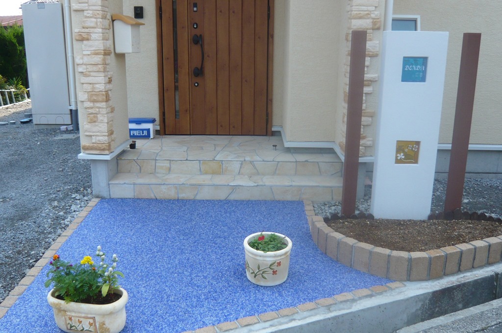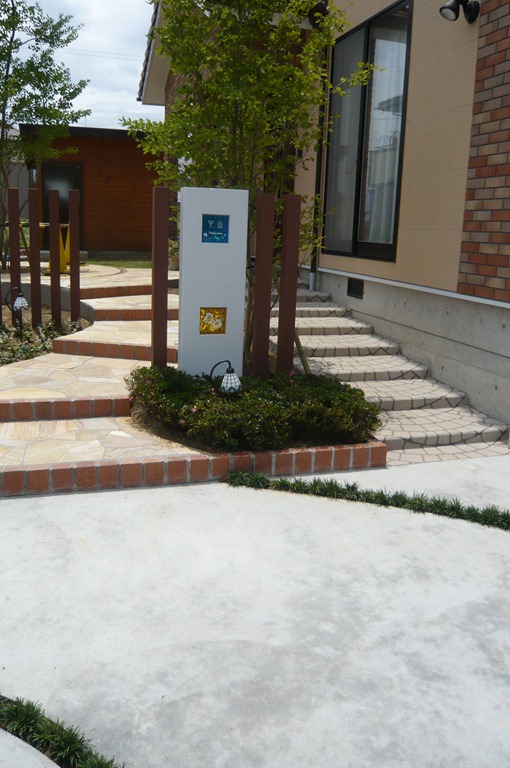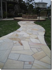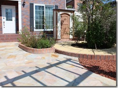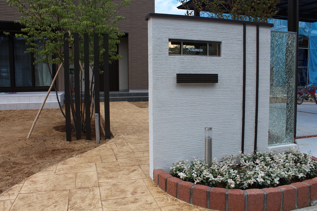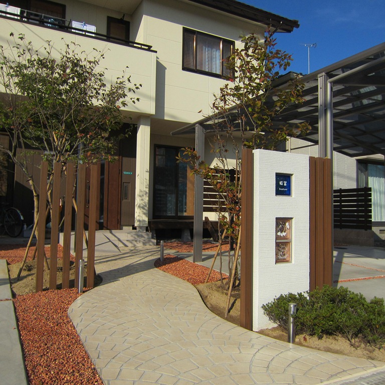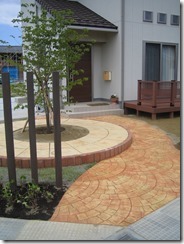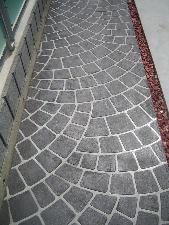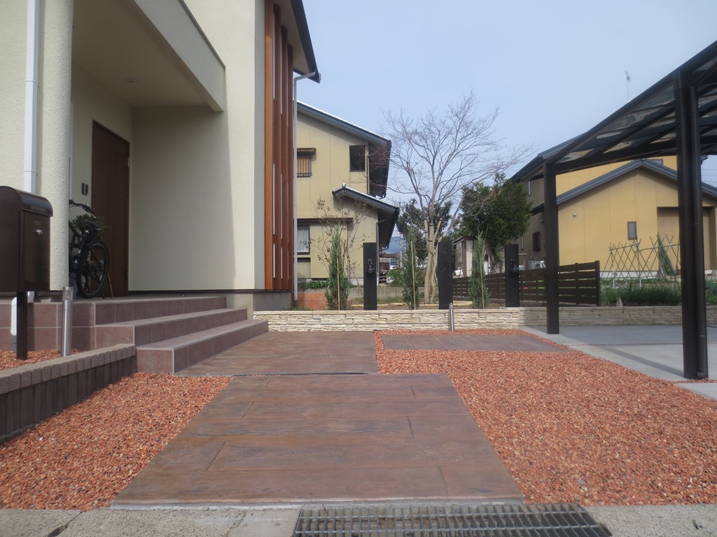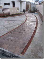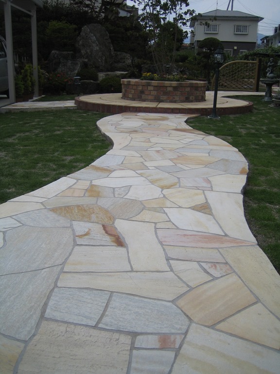 道路から門柱の横を通り曲線を描きながら続く通路を、HBサンドのカラーでヨーロピアンのパターンで仕上げた現場です。