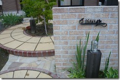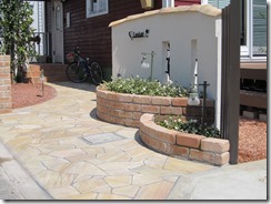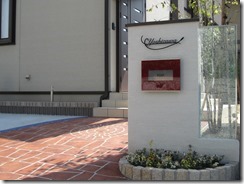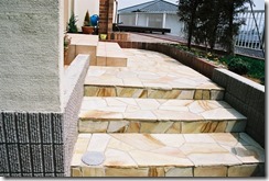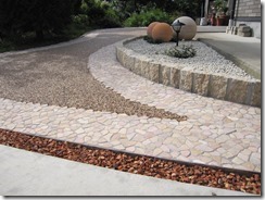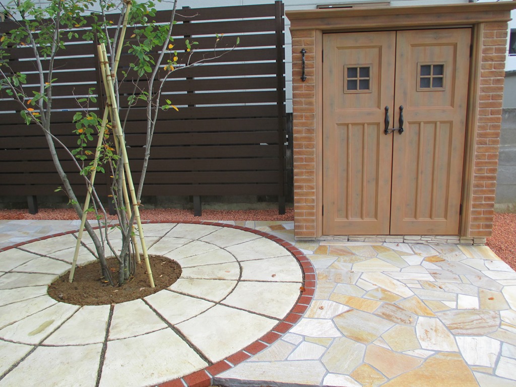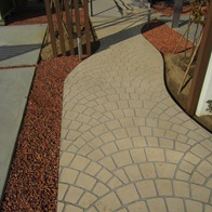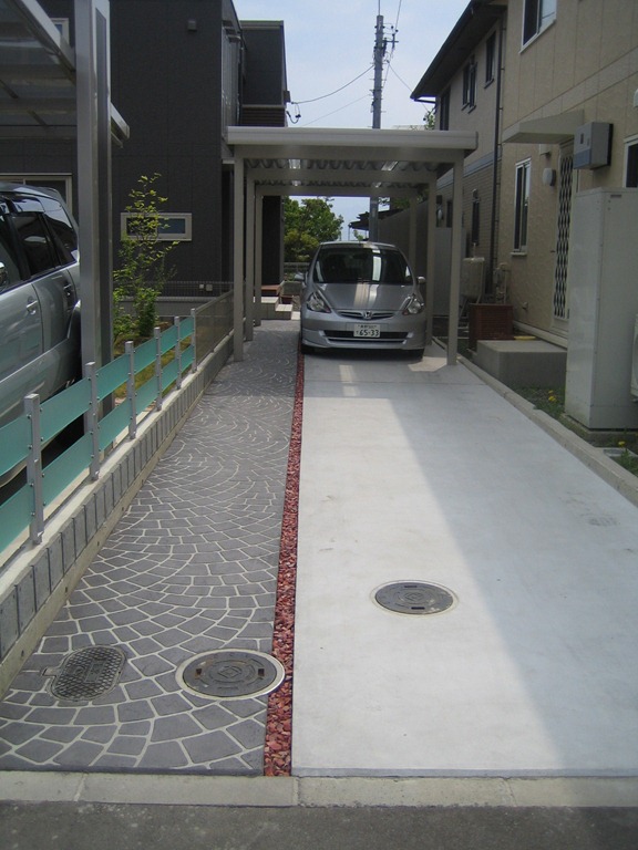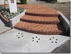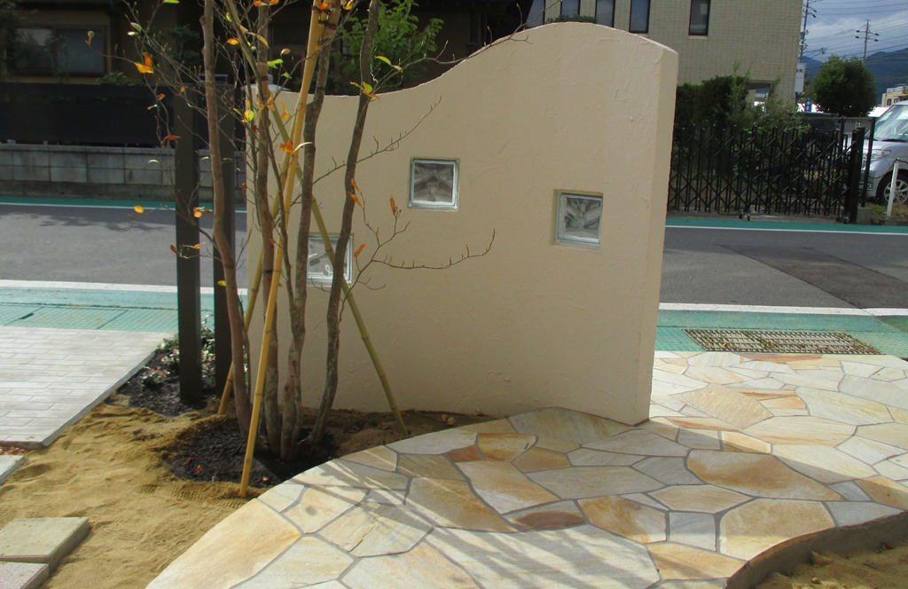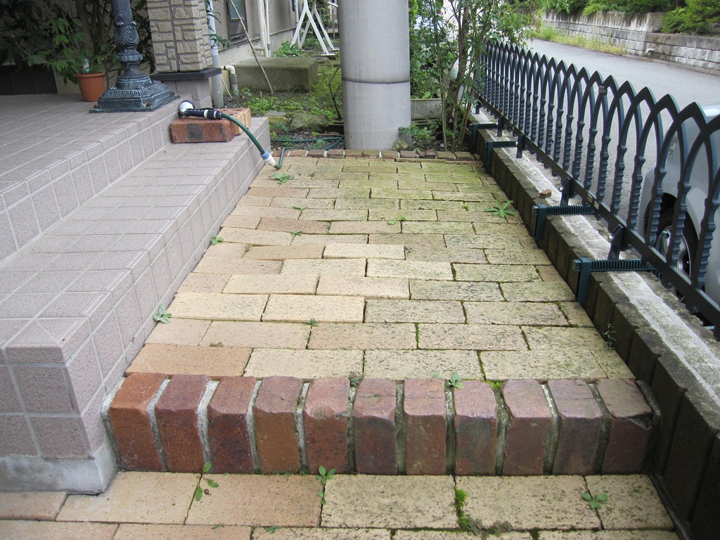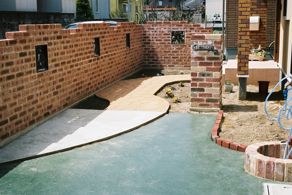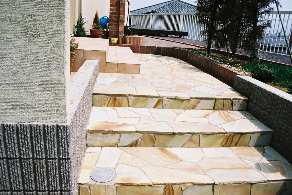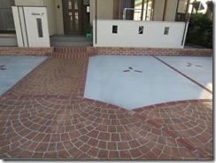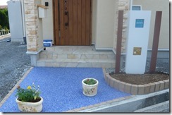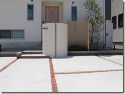 道路から門柱の横を通り曲線を描きながら続く通路を、HBサンドのカラーでヨーロピアンのパターンで仕上げた現場です。