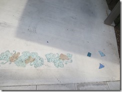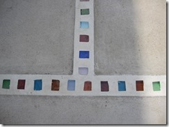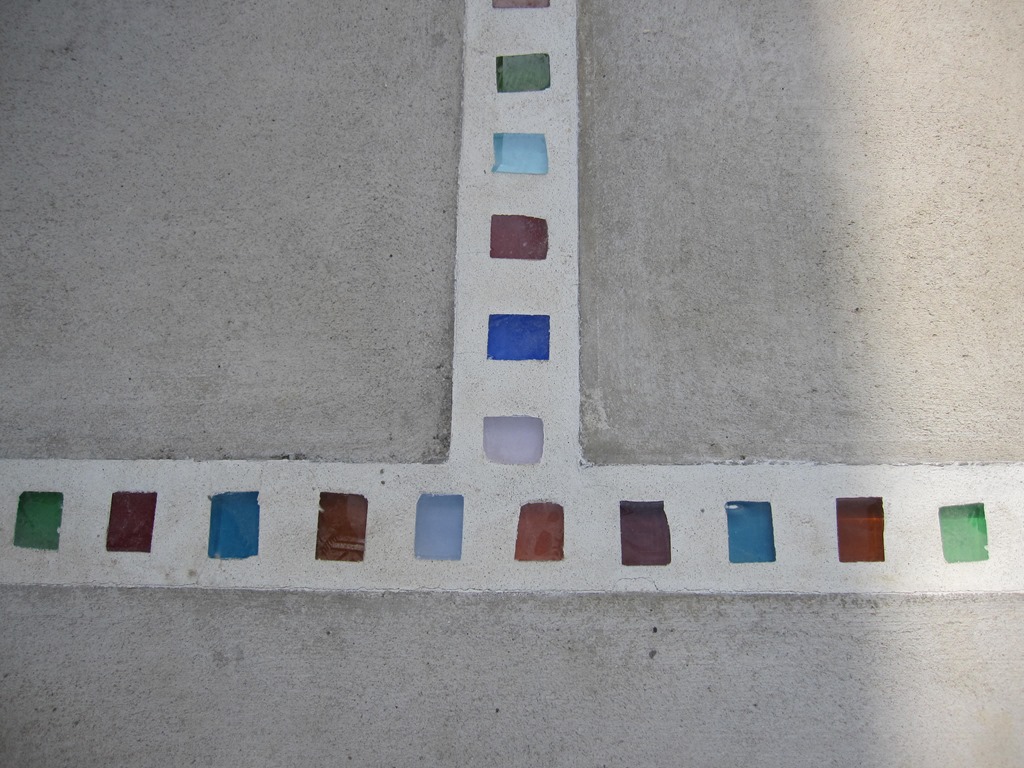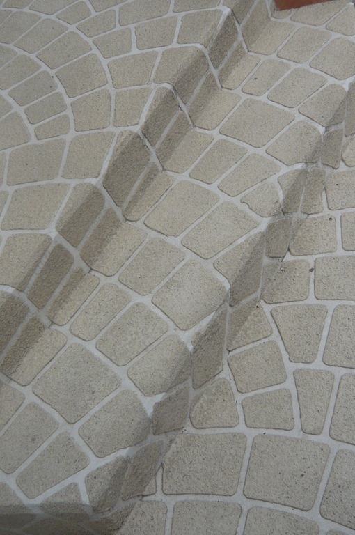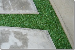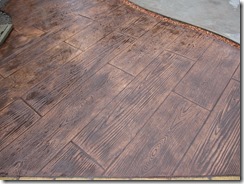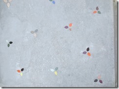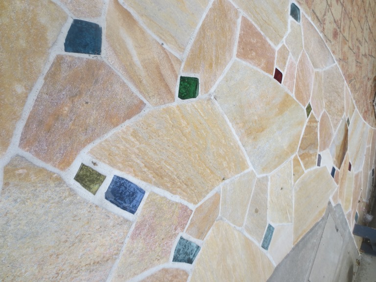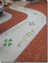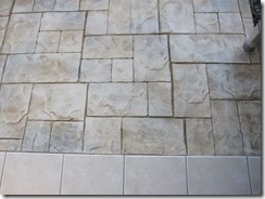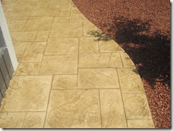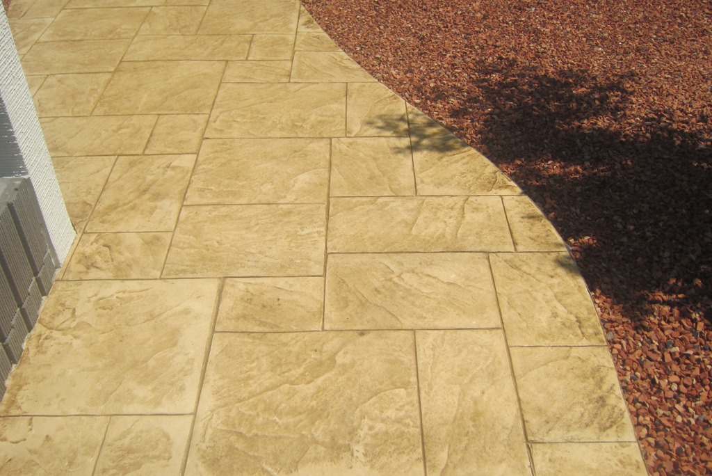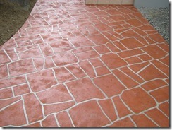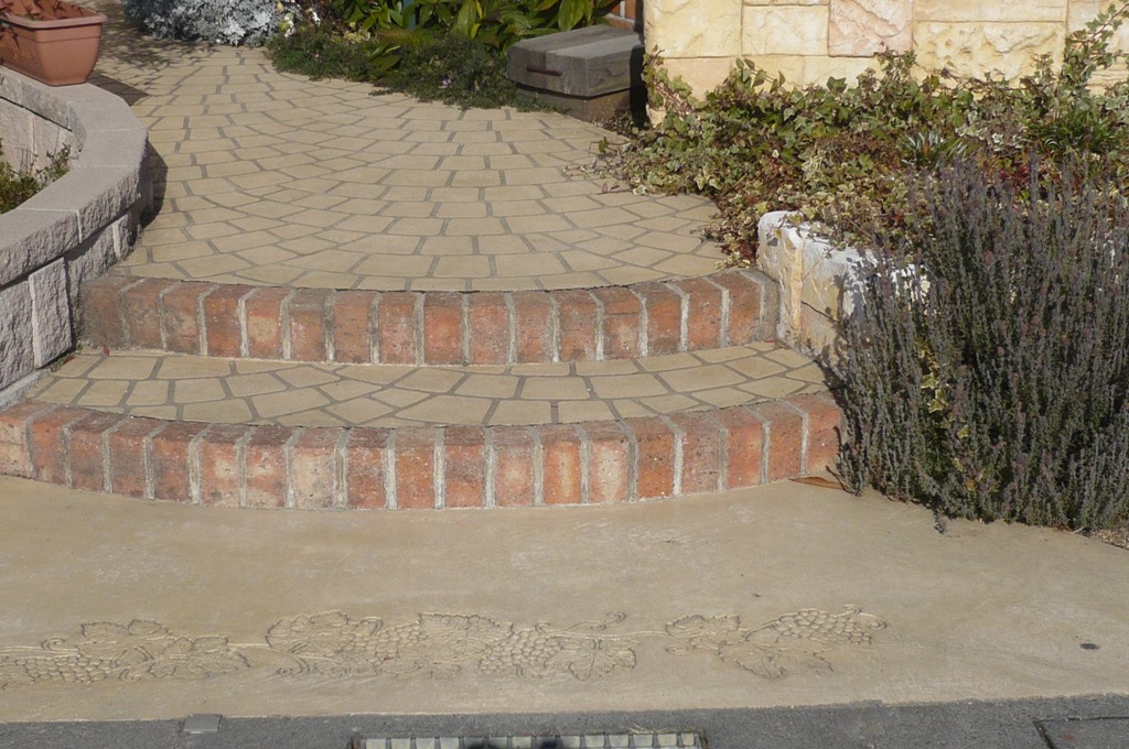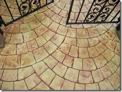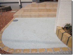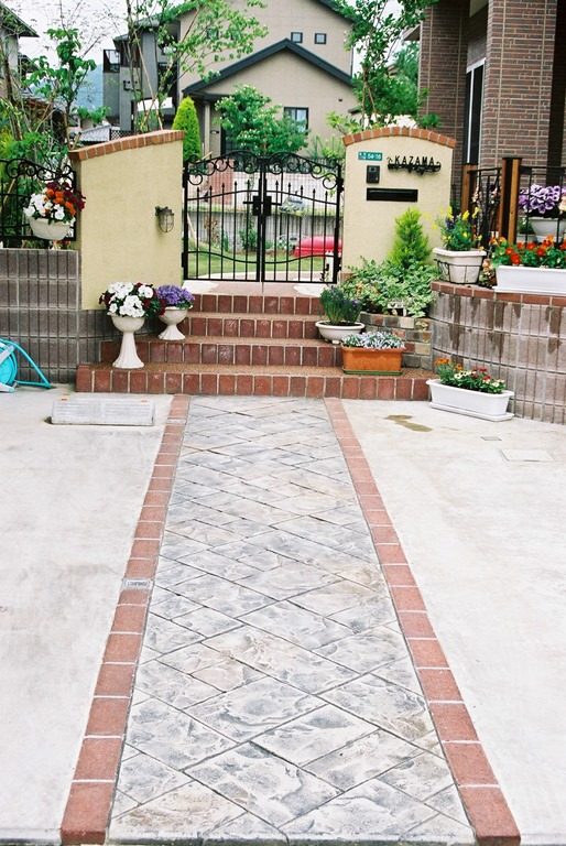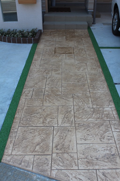 上の写真の左側は、手前の部分はステンシルを使用しないで色だけを付けた現場で、奥の玄関までの通路をステンシルのベージュに近い明るい色で仕上げています、右側の写真は手前をブッシュロックのパターンで色は緑色で仕上げています。